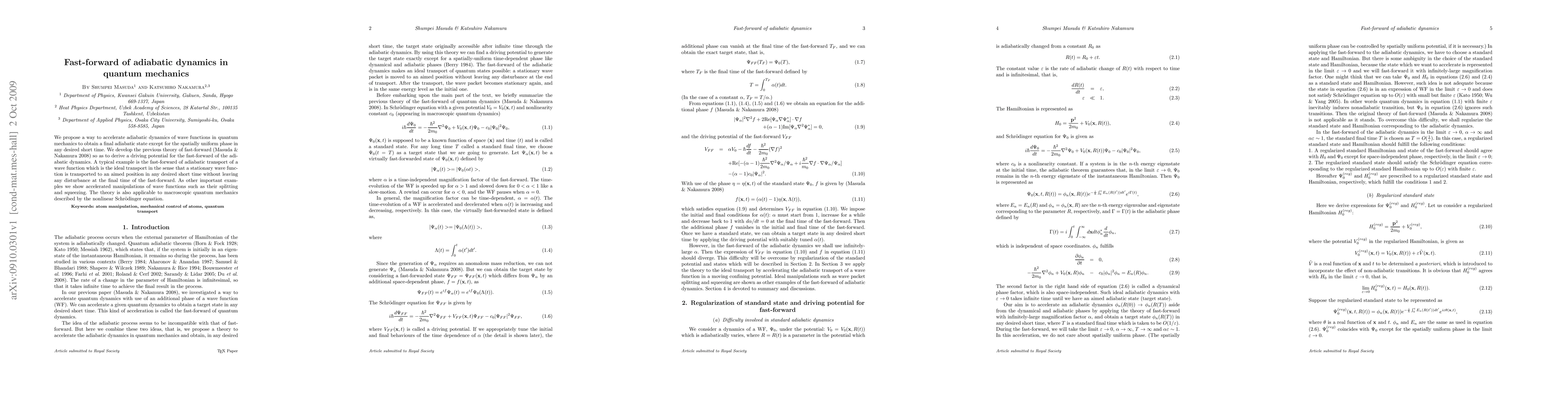 This paper proposes a method to accelerate adiabatic dynamics in quantum mechanics, achieving desired final states in short times without disturbances. It extends the fast-forward theory to derive a driving potential for manipulating wave functions, including transport, splitting, and squeezing, applicable to both microscopic and macroscopic quantum systems.