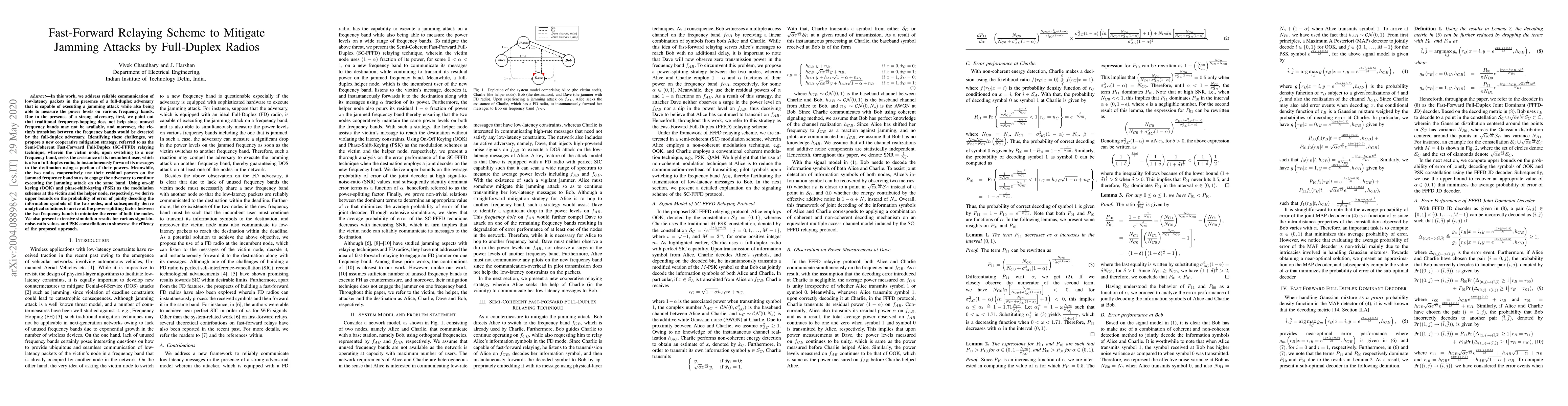 In this work, we address reliable communication of low-latency packets in the presence of a full-duplex adversary that is capable of executing a jamming attack while also being able to measure the power levels on various frequency bands. Due to the presence of a strong adversary, first, we point out that traditional frequency-hopping does not help since unused frequency bands may not be available, and moreover, the victim's transition between the frequency bands would be detected by the full-duplex adversary. Identifying these challenges, we propose a new cooperative mitigation strategy, referred to as the Semi-Coherent Fast-Forward Full-Duplex (SC-FFFD) relaying technique, wherein the victim node, upon switching to a new frequency band, seeks the assistance of its incumbent user, which is also a full-duplex radio, to instantaneously forward its messages to the destination using a portion of their powers. Meanwhile, the two nodes cooperatively use their residual powers on the jammed frequency band so as to engage the adversary to continue executing the jamming attack on the same band. Using on-off keying (OOK) and phase-shift-keying (PSK) as the modulation schemes at the victim and the helper node, respectively, we derive upper bounds on the probability of error of jointly decoding the information symbols of the two nodes, and subsequently derive analytical solutions to arrive at the power-splitting factor between the two frequency bands to minimize the error of both the nodes. We also present extensive simulation results for various signal-to-noise-ratio values and PSK constellations to showcase the efficacy of the proposed approach.