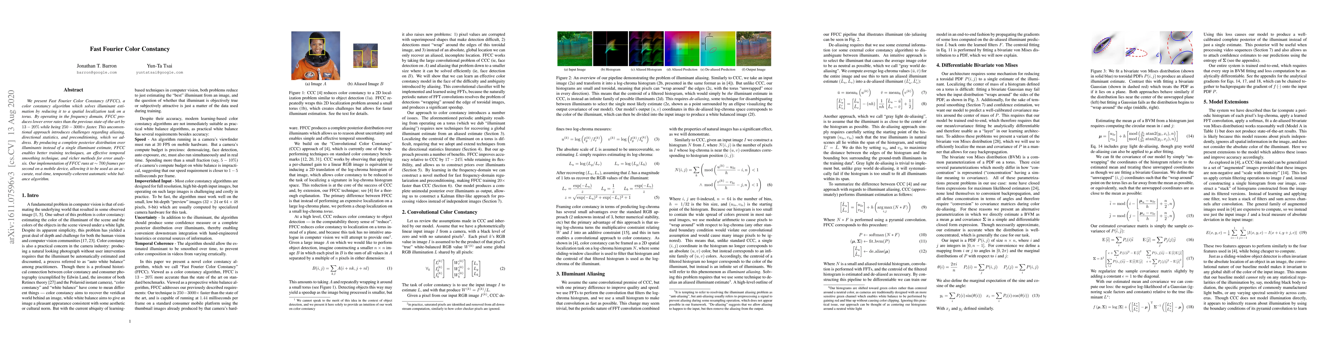 Fast Fourier Color Constancy (FFCC) is a novel algorithm for estimating illuminants that operates in the frequency domain, achieving 13-20% lower error rates and 250-3000 times faster than the previous best methods. It addresses challenges like aliasing and provides a complete posterior distribution over illuminants for improved training and error analysis.