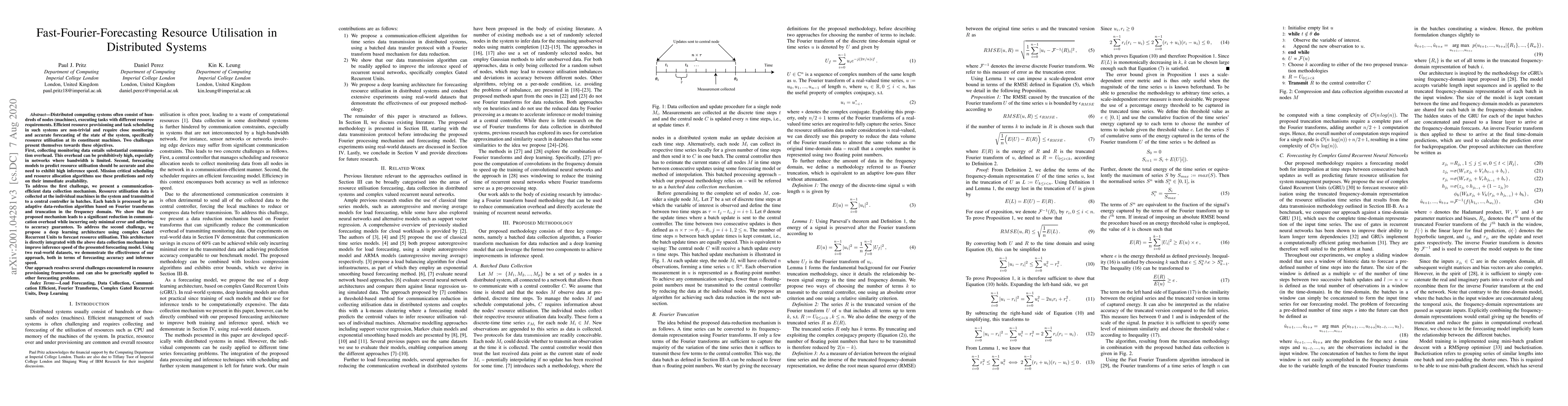 Distributed computing systems often consist of hundreds of nodes, executing tasks with different resource requirements. Efficient resource provisioning and task scheduling in such systems are non-trivial and require close monitoring and accurate forecasting of the state of the system, specifically resource utilisation at its constituent machines. Two challenges present themselves towards these objectives. First, collecting monitoring data entails substantial communication overhead. This overhead can be prohibitively high, especially in networks where bandwidth is limited. Second, forecasting models to predict resource utilisation should be accurate and need to exhibit high inference speed. Mission critical scheduling and resource allocation algorithms use these predictions and rely on their immediate availability. To address the first challenge, we present a communication-efficient data collection mechanism. Resource utilisation data is collected at the individual machines in the system and transmitted to a central controller in batches. Each batch is processed by an adaptive data-reduction algorithm based on Fourier transforms and truncation in the frequency domain. We show that the proposed mechanism leads to a significant reduction in communication overhead while incurring only minimal error and adhering to accuracy guarantees. To address the second challenge, we propose a deep learning architecture using complex Gated Recurrent Units to forecast resource utilisation. This architecture is directly integrated with the above data collection mechanism to improve inference speed of our forecasting model. Using two real-world datasets, we demonstrate the effectiveness of our approach, both in terms of forecasting accuracy and inference speed. Our approach resolves challenges encountered in resource provisioning frameworks and can be applied to other forecasting problems.