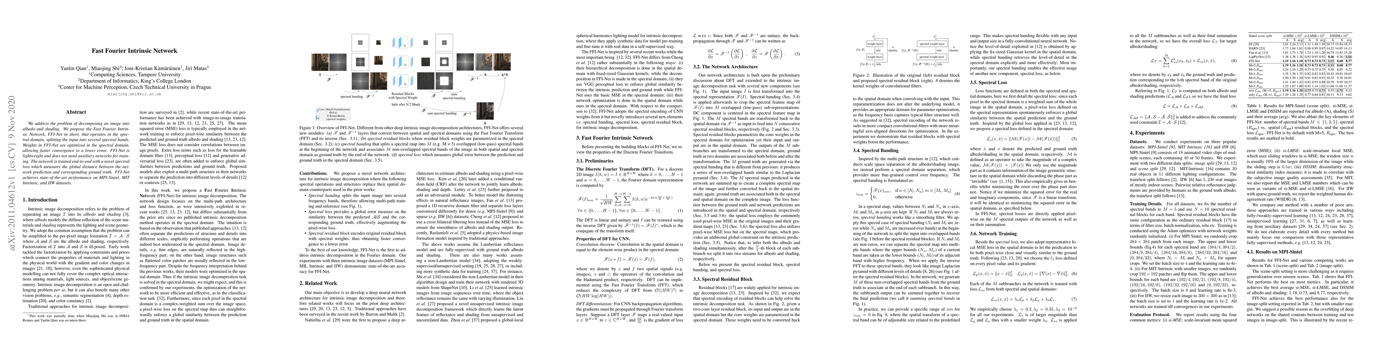 The Fast Fourier Intrinsic Network (FFI-Net) decomposes images into albedo and shading by operating in the spectral domain, achieving faster convergence and state-of-the-art performance on multiple datasets without requiring auxiliary networks. It employs a novel spectral loss for end-to-end training.
