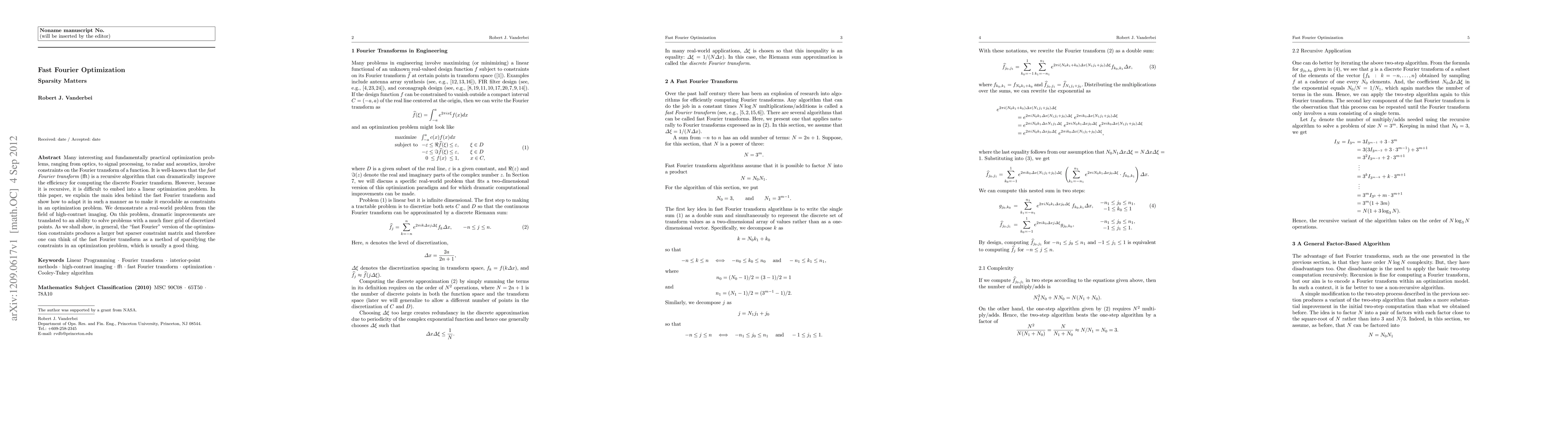 Many interesting and fundamentally practical optimization problems, ranging from optics, to signal processing, to radar and acoustics, involve constraints on the Fourier transform of a function. It is well-known that the {\em fast Fourier transform} (fft) is a recursive algorithm that can dramatically improve the efficiency for computing the discrete Fourier transform. However, because it is recursive, it is difficult to embed into a linear optimization problem. In this paper, we explain the main idea behind the fast Fourier transform and show how to adapt it in such a manner as to make it encodable as constraints in an optimization problem. We demonstrate a real-world problem from the field of high-contrast imaging. On this problem, dramatic improvements are translated to an ability to solve problems with a much finer grid of discretized points. As we shall show, in general, the "fast Fourier" version of the optimization constraints produces a larger but sparser constraint matrix and therefore one can think of the fast Fourier transform as a method of sparsifying the constraints in an optimization problem, which is usually a good thing.