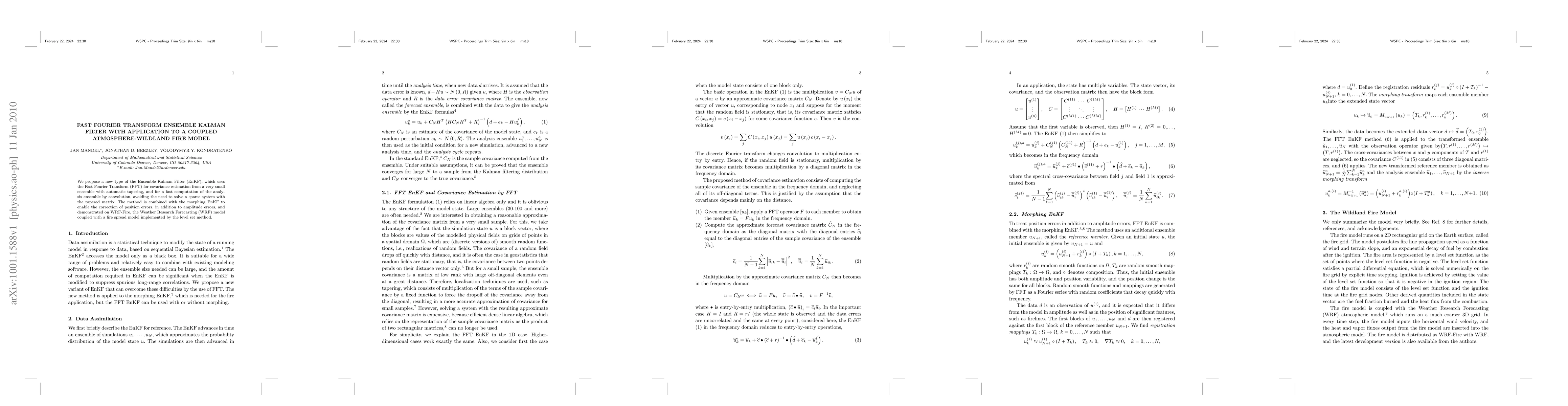 We propose a new type of the Ensemble Kalman Filter (EnKF), which uses the Fast Fourier Transform (FFT) for covariance estimation from a very small ensemble with automatic tapering, and for a fast computation of the analysis ensemble by convolution, avoiding the need to solve a sparse system with the tapered matrix. The FFT EnKF is combined with the morphing EnKF to enable the correction of position errors, in addition to amplitude errors, and demonstrated on WRF-Fire, the Weather Research Forecasting (WRF) model coupled with a fire spread model implemented by the level set method.