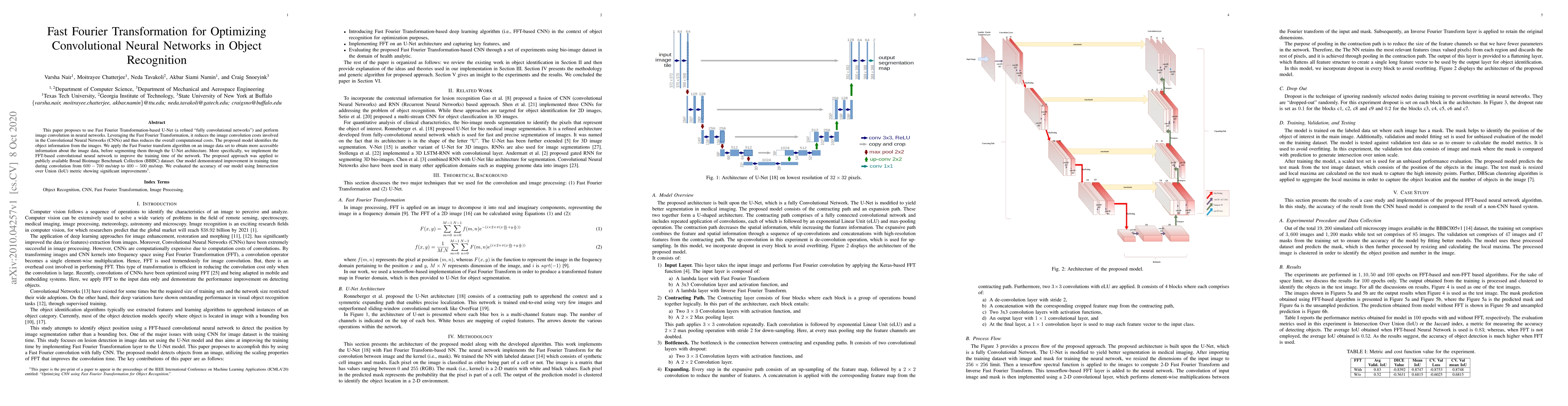 This paper proposes a Fast Fourier Transformation-based U-Net for optimizing Convolutional Neural Networks in object recognition, reducing computational costs and improving training time from 600-700 ms/step to 400-500 ms/step, while maintaining high accuracy as measured by Intersection over Union (IoU).