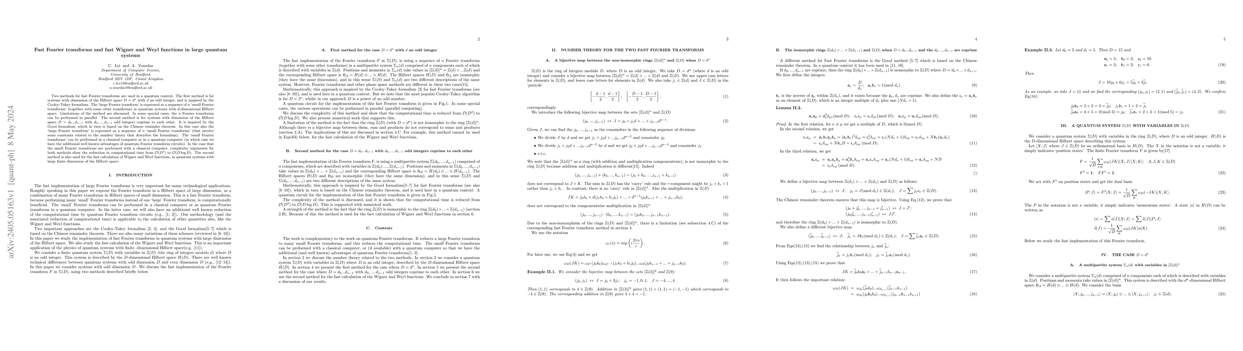 This paper presents two efficient methods for computing Fourier transforms in large quantum systems, utilizing the Cooley-Tukey and Good formalisms. The first method applies to systems with a Hilbert space dimension that is a power of an odd integer, while the second, based on the Chinese remainder theorem, is for systems with coprime dimensions. Both methods significantly reduce computational complexity from ${\cal O}(D^2)$ to ${\cal O}(D\log D)$. The second method also enables fast computation of Wigner and Weyl functions.