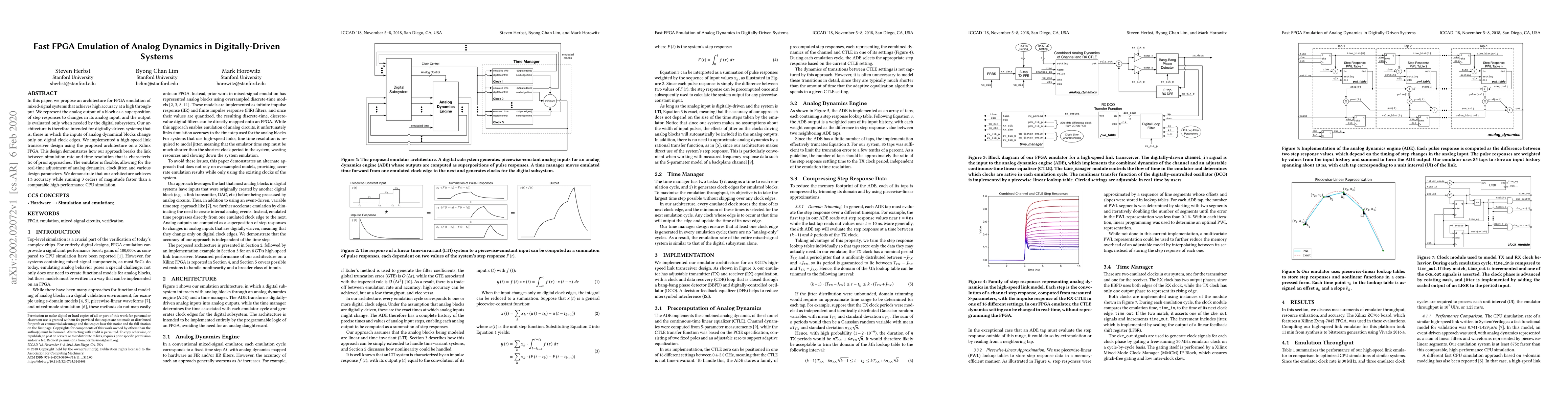 In this paper, we propose an architecture for FPGA emulation of mixed-signal systems that achieves high accuracy at a high throughput. We represent the analog output of a block as a superposition of step responses to changes in its analog input, and the output is evaluated only when needed by the digital subsystem. Our architecture is therefore intended for digitally-driven systems; that is, those in which the inputs of analog dynamical blocks change only on digital clock edges. We implemented a high-speed link transceiver design using the proposed architecture on a Xilinx FPGA. This design demonstrates how our approach breaks the link between simulation rate and time resolution that is characteristic of prior approaches. The emulator is flexible, allowing for the real-time adjustment of analog dynamics, clock jitter, and various design parameters. We demonstrate that our architecture achieves 1% accuracy while running 3 orders of magnitude faster than a comparable high-performance CPU simulation.