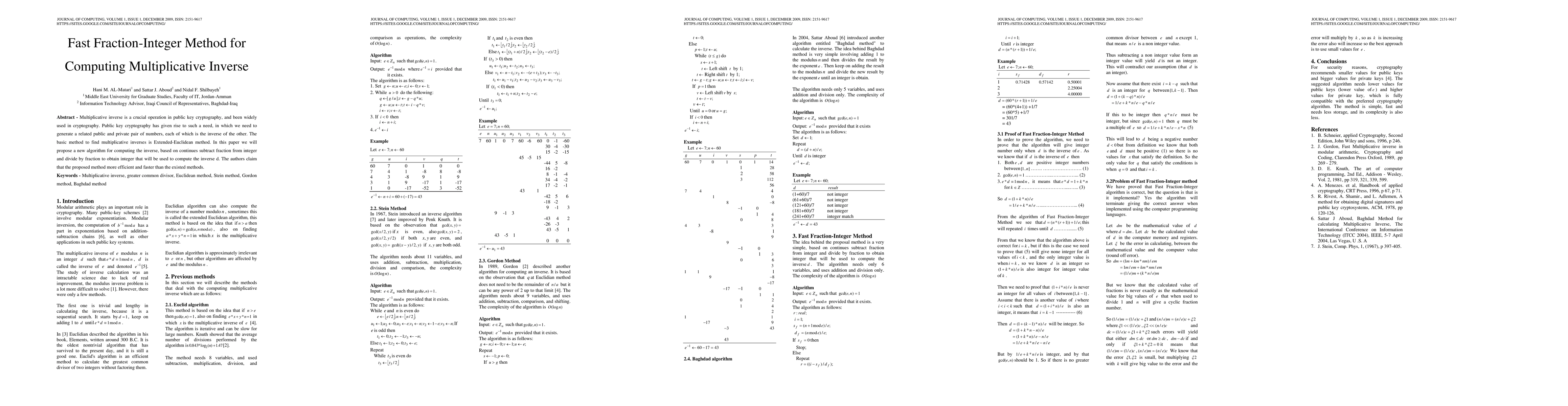 This paper proposes a new algorithm for computing multiplicative inverses using a fast fraction-integer method based on continued subtract fractions. The authors claim this method is more efficient and faster than existing methods like the Extended-Euclidean method, which is crucial for public key cryptography.