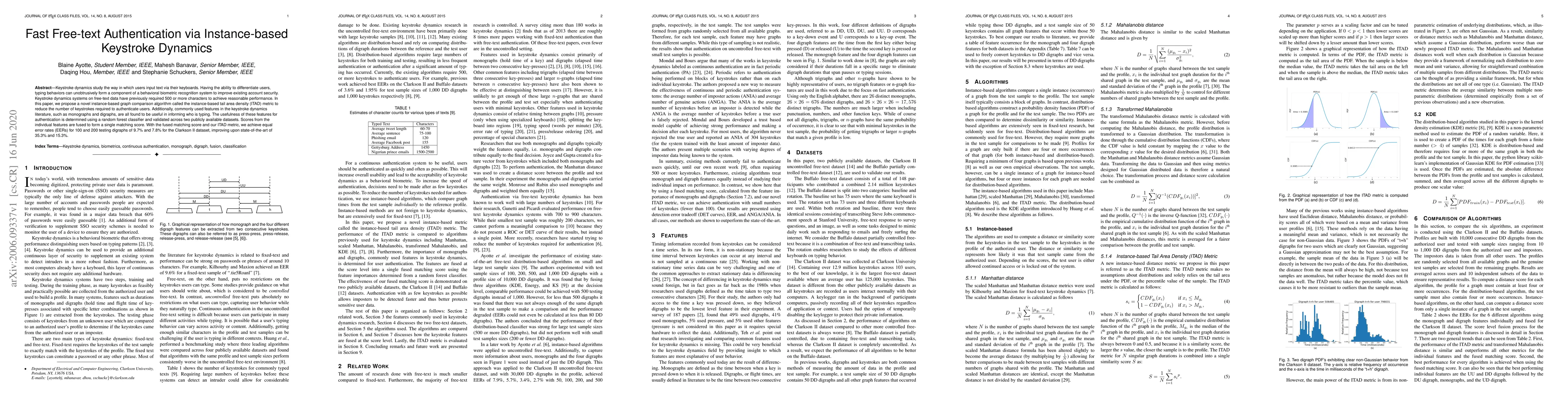 Keystroke dynamics study the way in which users input text via their keyboards. Having the ability to differentiate users, typing behaviors can unobtrusively form a component of a behavioral biometric recognition system to improve existing account security. Keystroke dynamics systems on free-text data have previously required 500 or more characters to achieve reasonable performance. In this paper, we propose a novel instance-based graph comparison algorithm called the instance-based tail area density (ITAD) metric to reduce the number of keystrokes required to authenticate users. Additionally, commonly used features in the keystroke dynamics literature, such as monographs and digraphs, are all found to be useful in informing who is typing. The usefulness of these features for authentication is determined using a random forest classifier and validated across two publicly available datasets. Scores from the individual features are fused to form a single matching score. With the fused matching score and our ITAD metric, we achieve equal error rates (EERs) for 100 and 200 testing digraphs of 9.7% and 7.8% for the Clarkson II dataset, improving upon state-of-the-art of 35.3% and 15.3%.