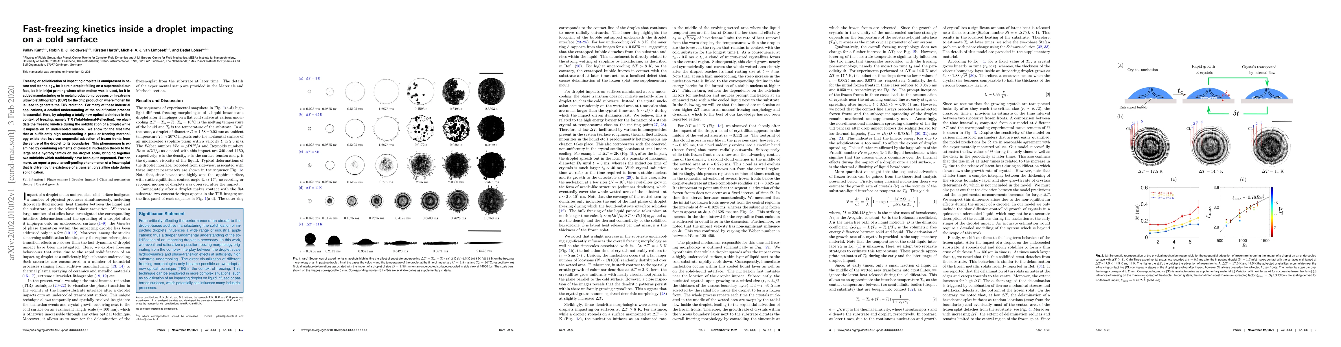 This paper employs a novel TIR optical technique to study the freezing kinetics of droplets impacting cold surfaces, revealing sequential advection of frozen fronts and a self-peeling phenomenon driven by transient crystalline states, combining classical nucleation theory with hydrodynamics.