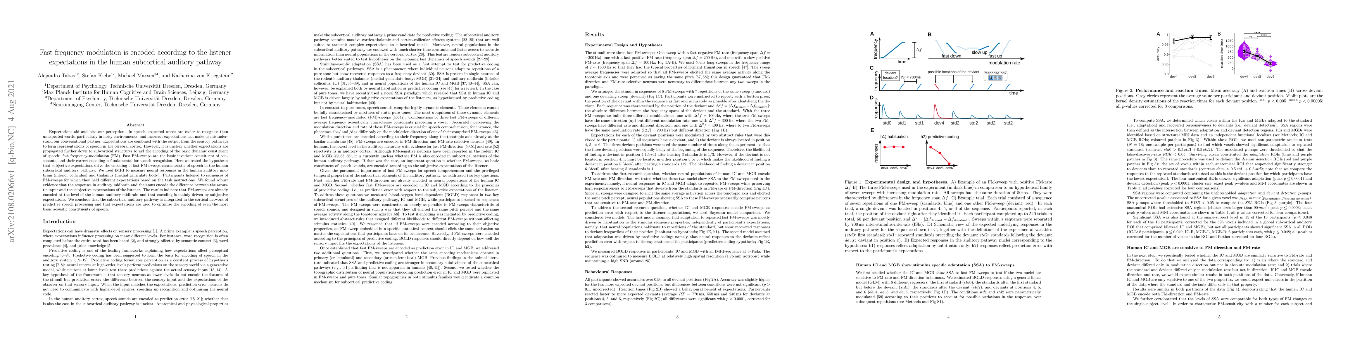 This study reveals that the human subcortical auditory pathway encodes fast frequency modulations (FM-sweeps) according to listener expectations, suggesting that the midbrain and thalamus are involved in optimizing the basic acoustic constituents of speech based on prior knowledge. fMRI data show that neural responses in these regions reflect the difference between acoustic input and listener expectations, indicating a predictive role in speech processing.