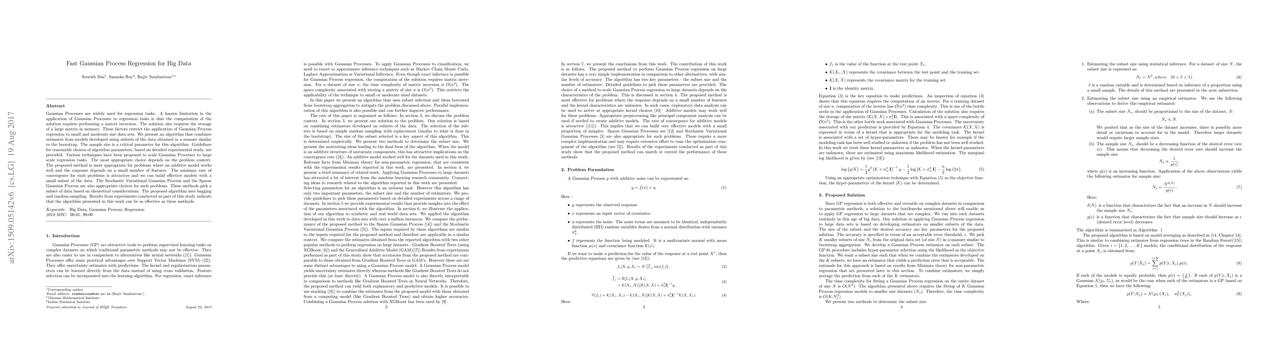 Gaussian Processes are widely used for regression tasks. A known limitation in the application of Gaussian Processes to regression tasks is that the computation of the solution requires performing a matrix inversion. The solution also requires the storage of a large matrix in memory. These factors restrict the application of Gaussian Process regression to small and moderate size data sets. We present an algorithm that combines estimates from models developed using subsets of the data obtained in a manner similar to the bootstrap. The sample size is a critical parameter for this algorithm. Guidelines for reasonable choices of algorithm parameters, based on detailed experimental study, are provided. Various techniques have been proposed to scale Gaussian Processes to large scale regression tasks. The most appropriate choice depends on the problem context. The proposed method is most appropriate for problems where an additive model works well and the response depends on a small number of features. The minimax rate of convergence for such problems is attractive and we can build effective models with a small subset of the data. The Stochastic Variational Gaussian Process and the Sparse Gaussian Process are also appropriate choices for such problems. These methods pick a subset of data based on theoretical considerations. The proposed algorithm uses bagging and random sampling. Results from experiments conducted as part of this study indicate that the algorithm presented in this work can be as effective as these methods. Model stacking can be used to combine the model developed with the proposed method with models from other methods for large scale regression such as Gradient Boosted Trees. This can yield performance gains.