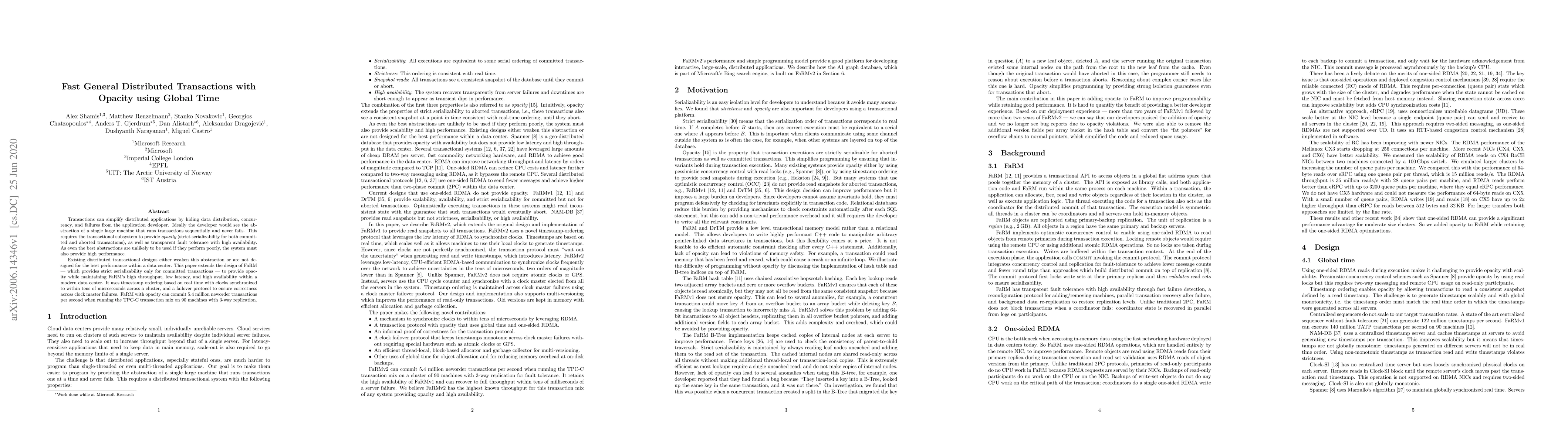 This paper proposes an enhanced version of FaRM to provide opacity in distributed transactions, ensuring strict serializability for both committed and aborted transactions while maintaining high throughput and low latency. It achieves this using timestamp ordering based on synchronized real-time clocks and a failover protocol, achieving 5.4 million neworder transactions per second on 90 machines.