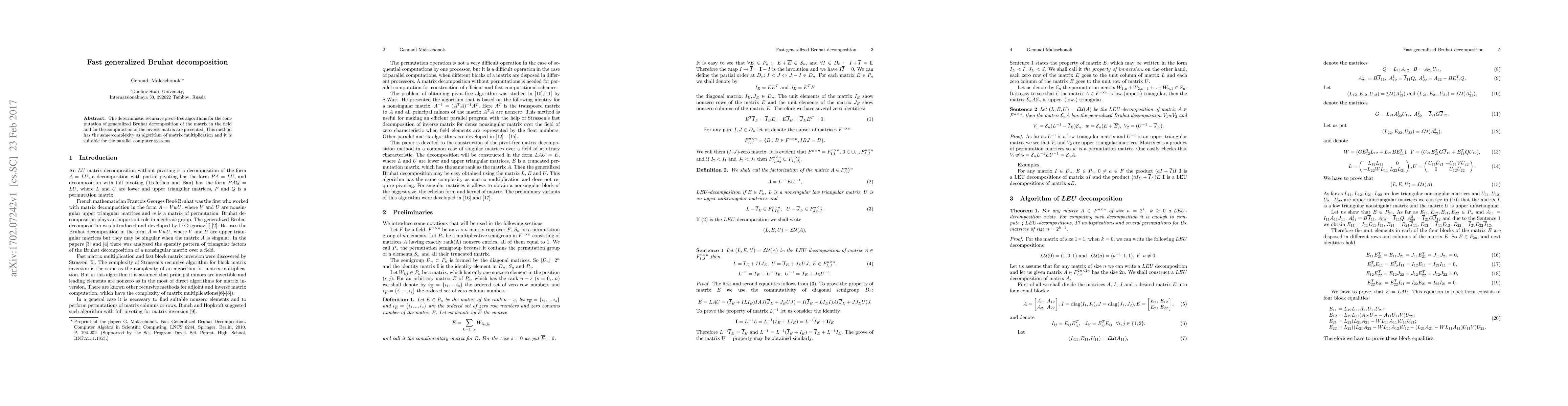 Summary: This paper introduces deterministic, pivot-free algorithms for computing generalized Bruhat decomposition and inverse matrices, matching the complexity of matrix multiplication and enabling efficient parallel computation.
