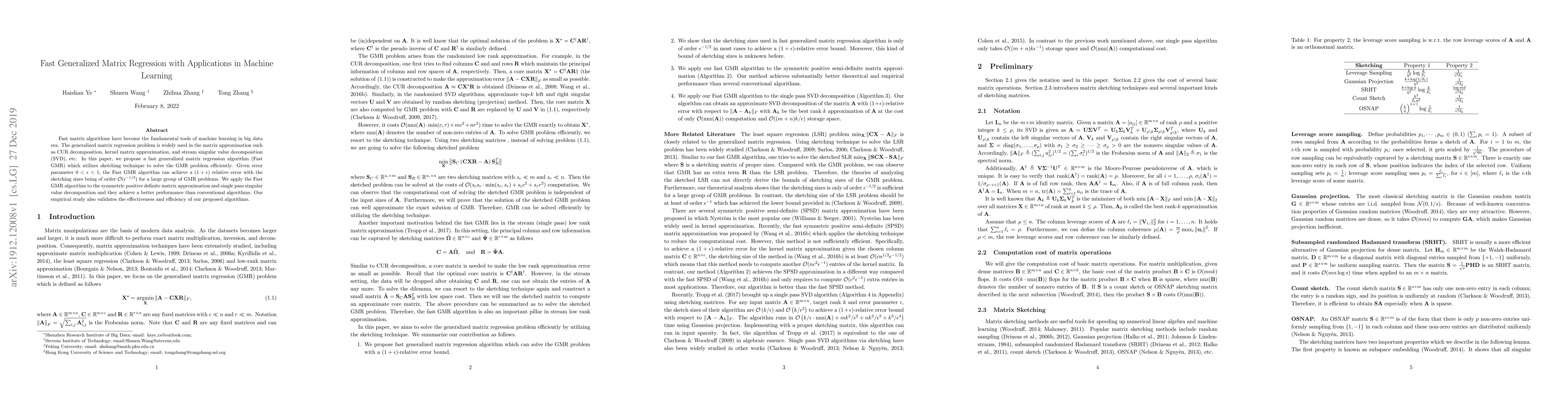 Fast matrix algorithms have become the fundamental tools of machine learning in big data era. The generalized matrix regression problem is widely used in the matrix approximation such as CUR decomposition, kernel matrix approximation, and stream singular value decomposition (SVD), etc. In this paper, we propose a fast generalized matrix regression algorithm (Fast GMR) which utilizes sketching technique to solve the GMR problem efficiently. Given error parameter $0<\epsilon<1$, the Fast GMR algorithm can achieve a $(1+\epsilon)$ relative error with the sketching sizes being of order $\cO(\epsilon^{-1/2})$ for a large group of GMR problems. We apply the Fast GMR algorithm to the symmetric positive definite matrix approximation and single pass singular value decomposition and they achieve a better performance than conventional algorithms. Our empirical study also validates the effectiveness and efficiency of our proposed algorithms.