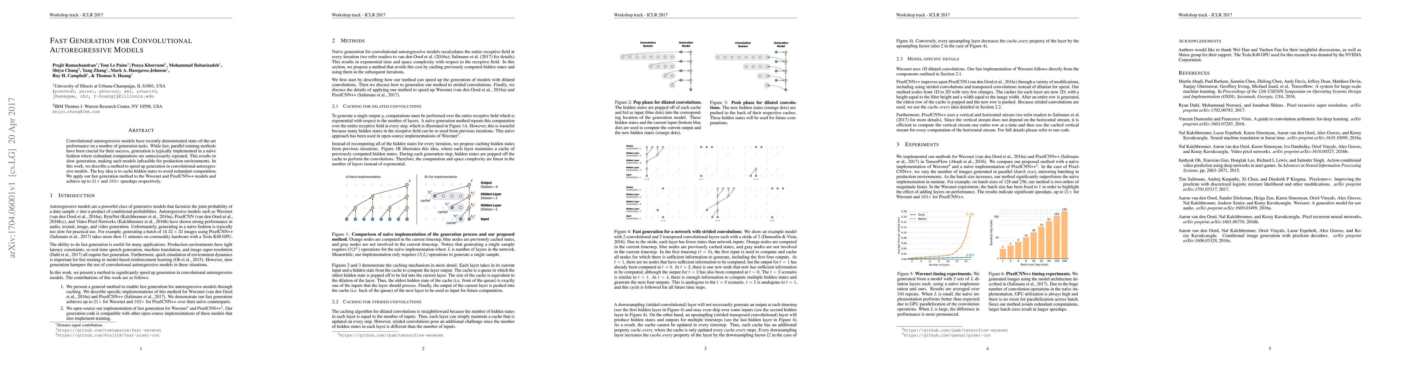This paper presents a method to accelerate generation in convolutional autoregressive models by caching hidden states to avoid redundant computations, achieving up to 21x and 183x speedups in Wavenet and PixelCNN++ models respectively.