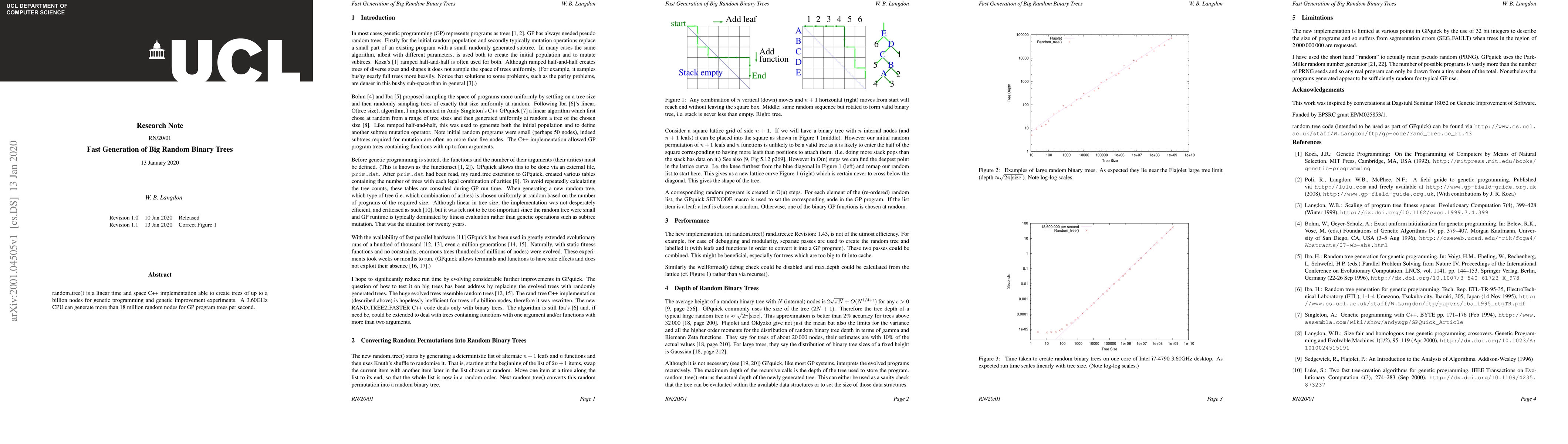 random_tree() is a linear time and space C++ implementation able to create trees of up to a billion nodes for genetic programming and genetic improvement experiments. A 3.60GHz CPU can generate more than 18 million random nodes for GP program trees per second.