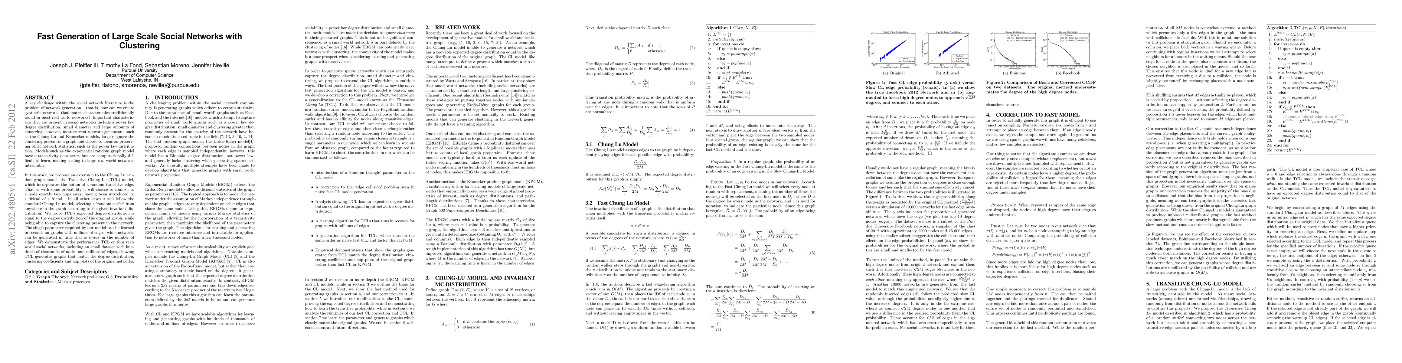 This paper proposes the Transitive Chung Lu (TCL) model to generate large-scale synthetic social networks that accurately replicate the power law degree distribution, small diameter, and significant clustering found in real-world networks. The TCL model efficiently learns a single parameter and scales linearly with the number of edges, generating networks that match the original's degree distribution, clustering coefficients, and hop plots.