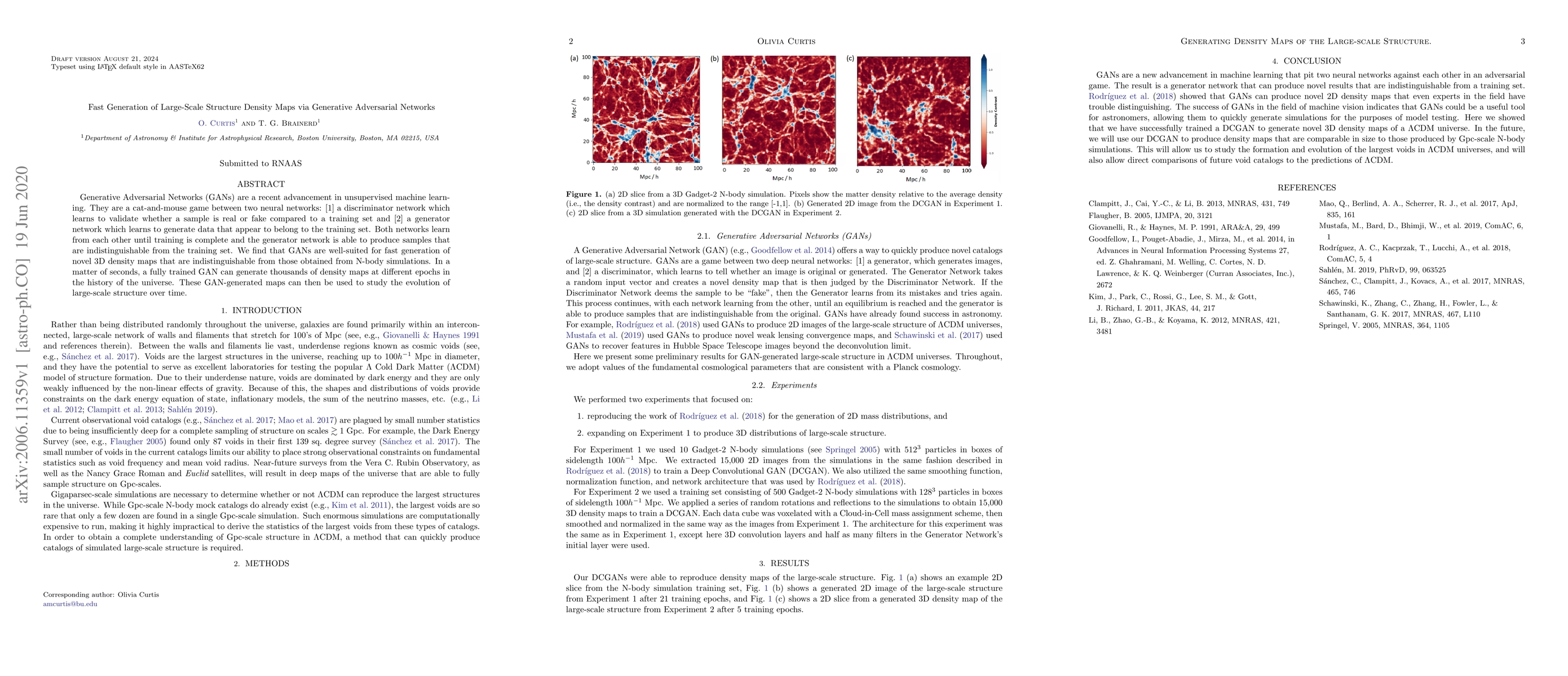 This paper demonstrates that Generative Adversarial Networks (GANs) efficiently generate large-scale structure density maps comparable to those from N-body simulations, enabling rapid study of cosmic structure evolution. The GAN-generated maps are indistinguishable from real data, allowing for quick production of thousands of maps at different cosmic epochs.