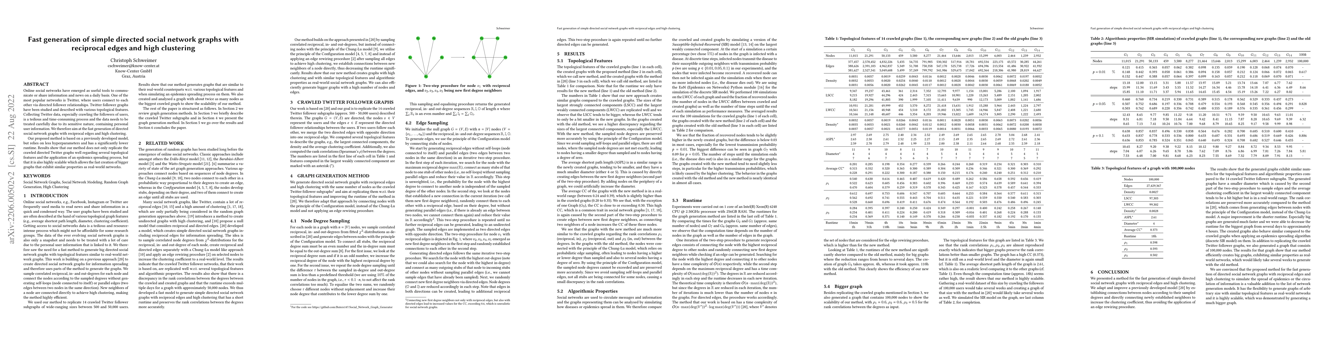 The research proposes a method for fast generation of simple directed social network graphs with reciprocal edges and high clustering, building on a previous model by sampling correlated reciprocal, in- and out-degrees using the Configuration model's principles instead of the Chung-Lu model. This new method significantly reduces runtime by directly establishing connections between new neighbors of a node.