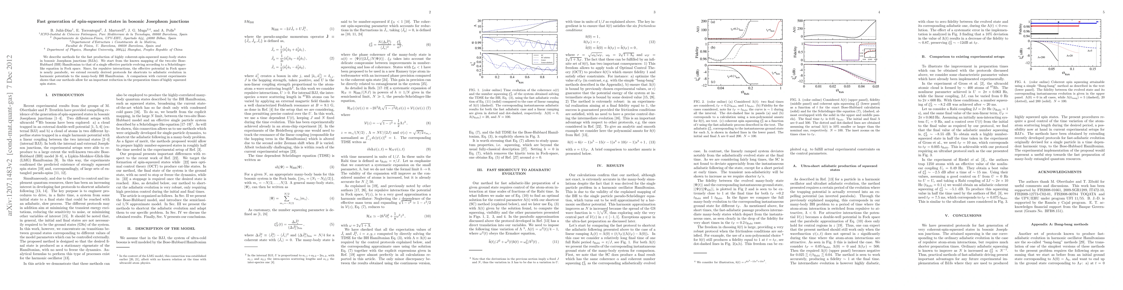 This paper outlines techniques for rapidly generating highly coherent spin-squeezed states in bosonic Josephson junctions by leveraging mappings from the Bose-Hubbard model to a Schrödinger-like equation. It applies protocols for shortcuts to adiabatic evolution to achieve optimal scaling of the squeezing parameter with the number of atoms.