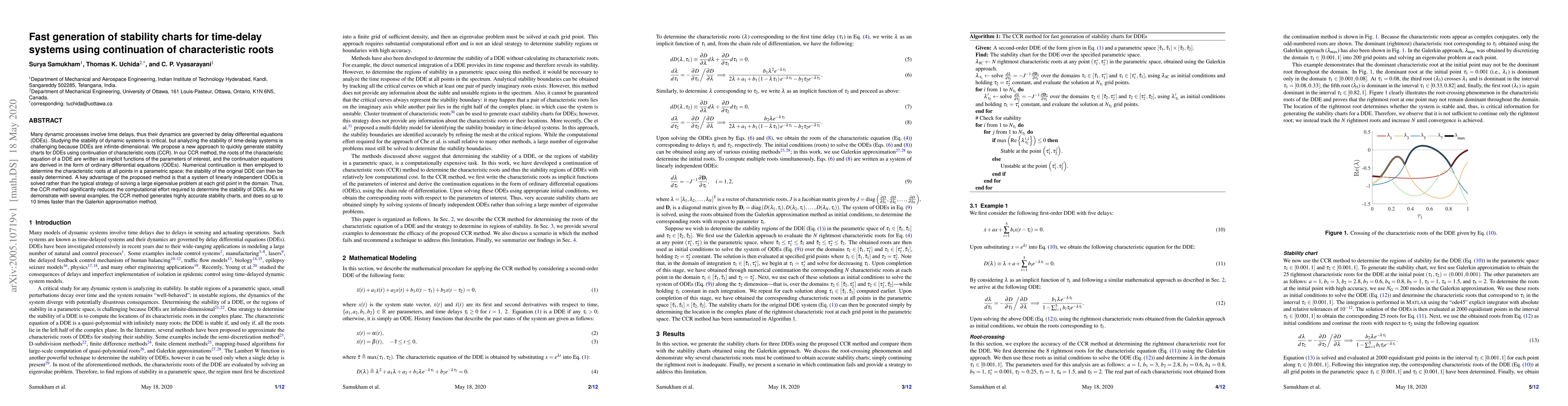This paper proposes a new method for quickly generating stability charts for delay differential equations (DDEs) using continuation of characteristic roots (CCR). The CCR method reduces computational effort by solving a system of ordinary differential equations instead of large eigenvalue problems, achieving up to 10 times faster results compared to the Galerkin approximation method.