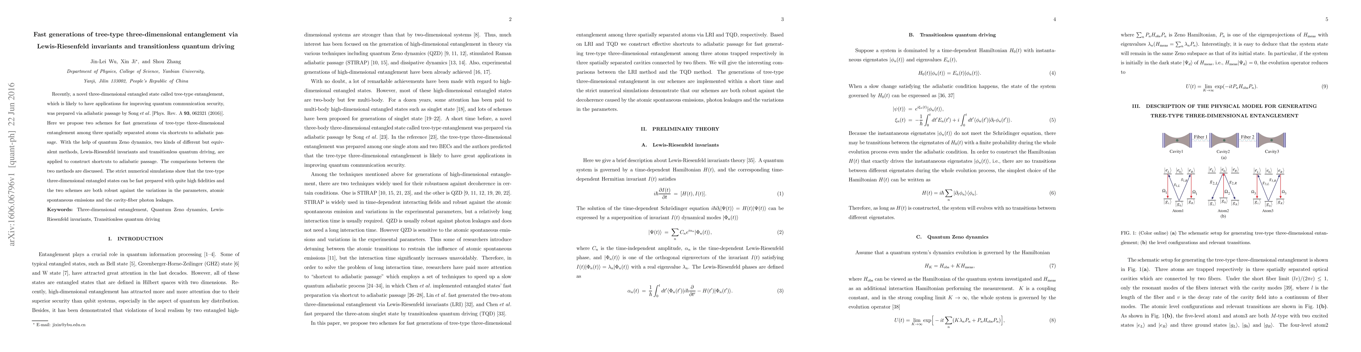 This paper proposes two fast schemes for generating tree-type three-dimensional entanglement among three spatially separated atoms using shortcuts to adiabatic passage, based on Lewis-Riesenfeld invariants and transitionless quantum driving. Numerical simulations demonstrate high fidelity and robustness against various parameter variations and losses.