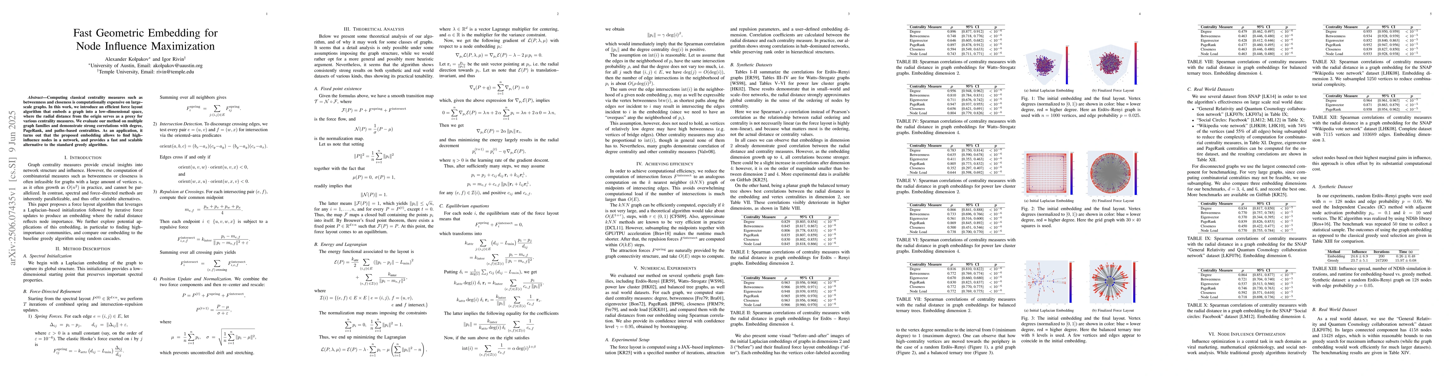Computing classical centrality measures such as betweenness and closeness is computationally expensive on large-scale graphs. In this work, we introduce an efficient force layout algorithm that embeds a graph into a low-dimensional space, where the radial distance from the origin serves as a proxy for various centrality measures. We evaluate our method on multiple graph families and demonstrate strong correlations with degree, PageRank, and paths-based centralities. As an application, it turns out that the proposed embedding allows to find high-influence nodes in a network, and provides a fast and scalable alternative to the standard greedy algorithm.