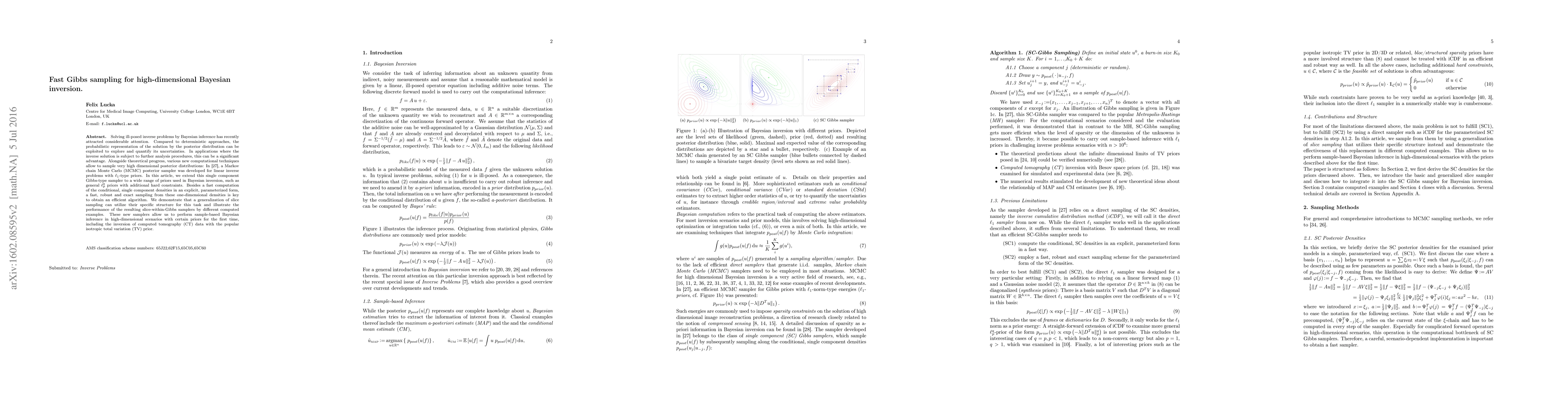 This paper presents an efficient Gibbs sampling method for high-dimensional Bayesian inversion, extending previous MCMC techniques to handle a wide range of priors. It introduces a slice-within-Gibbs sampler that leverages the specific structure of one-dimensional densities for fast and robust sampling, enabling sample-based Bayesian inference in complex scenarios like computed tomography.