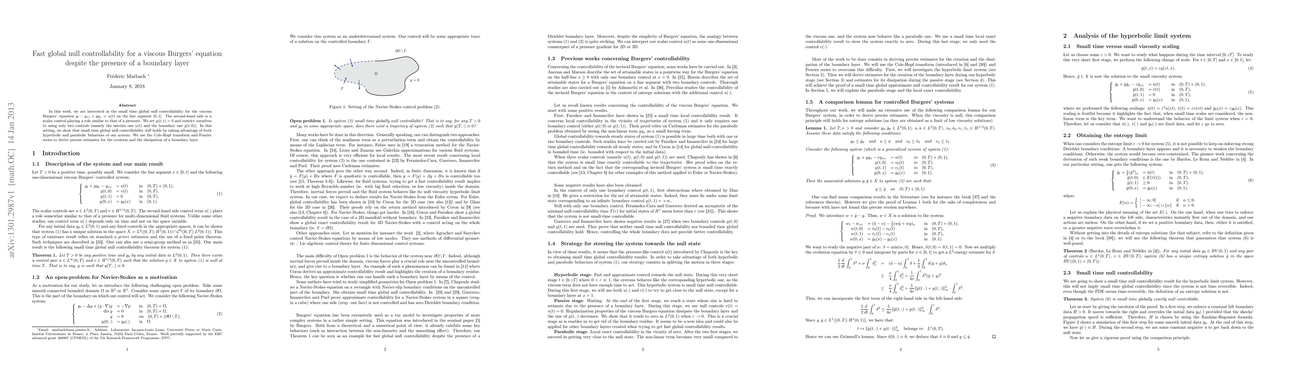 This paper investigates small time global null controllability for the viscous Burgers' equation on the interval [0,1], demonstrating that it is achievable despite the presence of a boundary layer. The study utilizes the Cole-Hopf transform and Fourier series to derive estimates that account for both hyperbolic and parabolic dynamics.