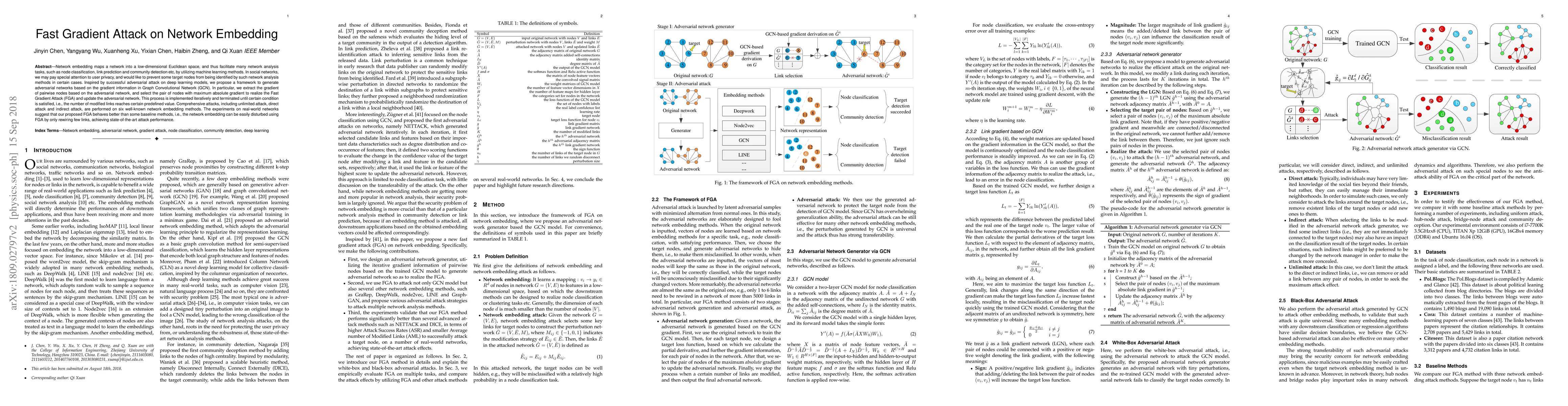 This paper proposes a Fast Gradient Attack (FGA) framework to generate adversarial networks targeting network embedding methods, particularly Graph Convolutional Networks (GCN). The FGA iteratively selects node pairs with maximum gradient to modify network links, achieving state-of-the-art performance in disturbing network embeddings with minimal changes.