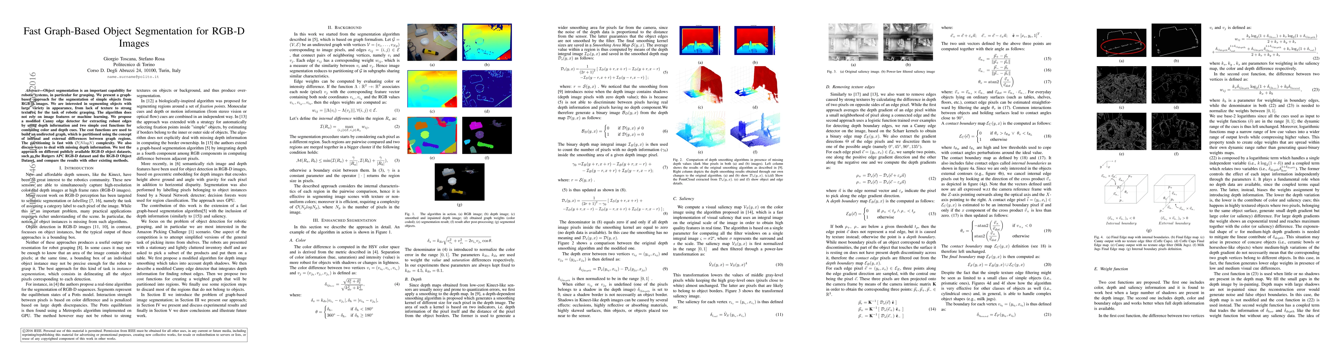 The paper introduces a modified Canny edge detector that integrates depth information for robust edge detection and proposes two cost functions for graph-based segmentation, combining color, depth, and saliency cues.