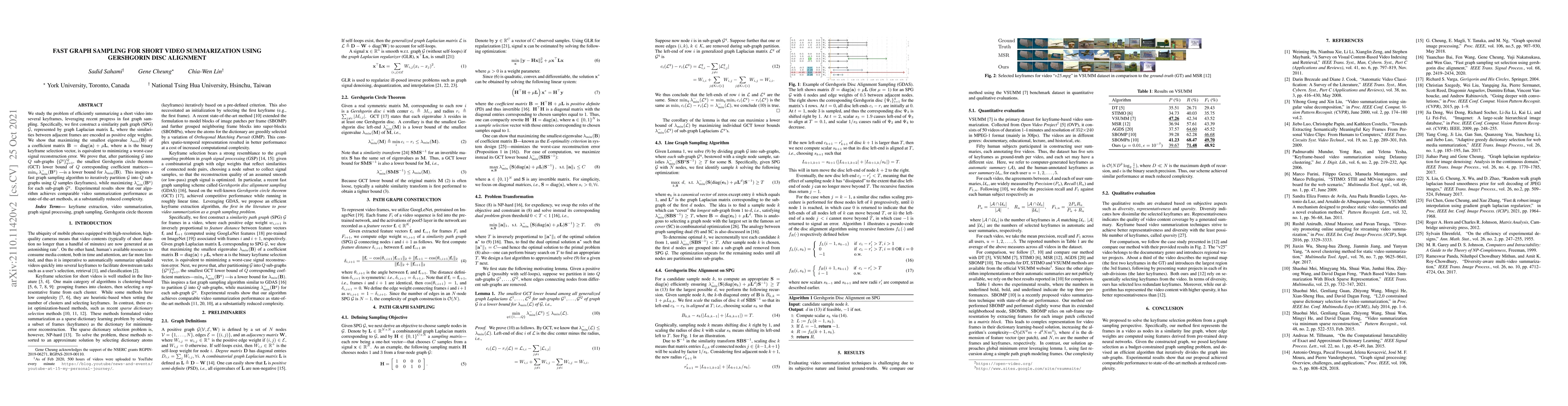 A new algorithm for summarizing short videos into keyframes uses fast graph sampling to reduce complexity while maintaining performance.