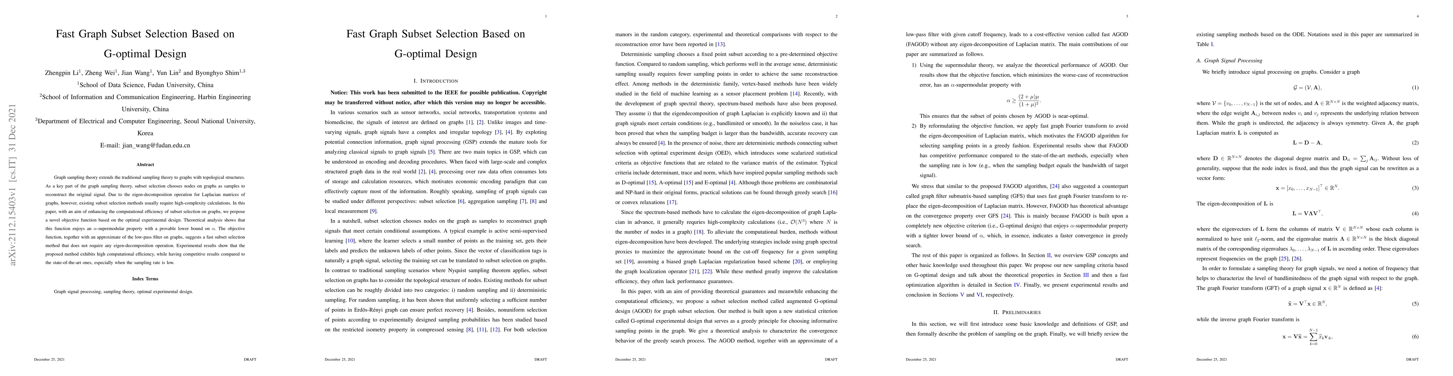 Graph sampling theory extends the traditional sampling theory to graphs with topological structures. As a key part of the graph sampling theory, subset selection chooses nodes on graphs as samples to reconstruct the original signal. Due to the eigen-decomposition operation for Laplacian matrices of graphs, however, existing subset selection methods usually require high-complexity calculations. In this paper, with an aim of enhancing the computational efficiency of subset selection on graphs, we propose a novel objective function based on the optimal experimental design. Theoretical analysis shows that this function enjoys an $\alpha$-supermodular property with a provable lower bound on $\alpha$. The objective function, together with an approximate of the low-pass filter on graphs, suggests a fast subset selection method that does not require any eigen-decomposition operation. Experimental results show that the proposed method exhibits high computational efficiency, while having competitive results compared to the state-of-the-art ones, especially when the sampling rate is low.