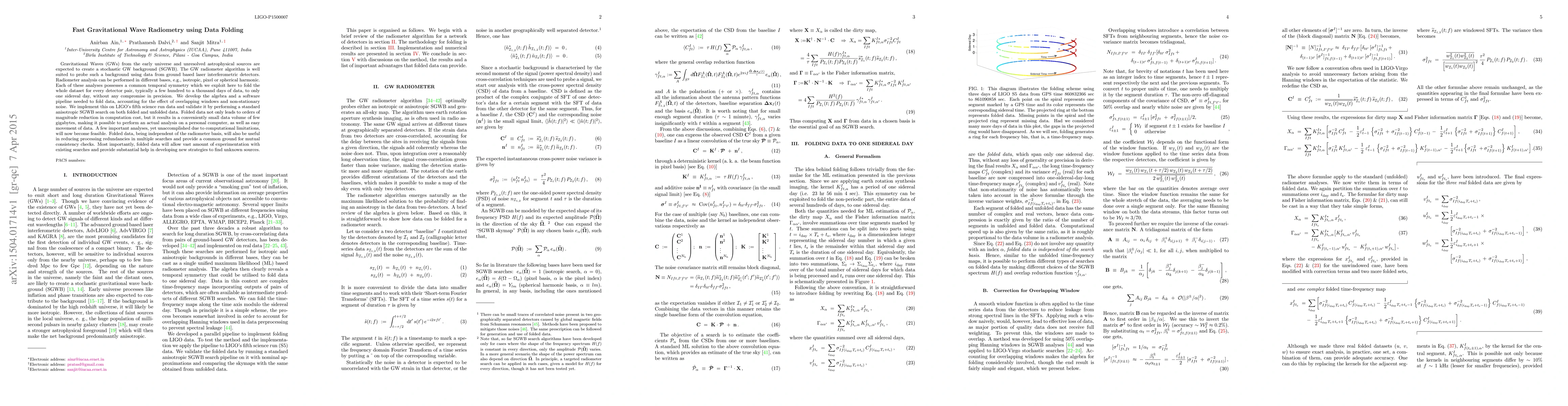 Gravitational Waves (GWs) from the early universe and unresolved astrophysical sources are expected to create a stochastic GW background (SGWB). The GW radiometer algorithm is well suited to probe such a background using data from ground based laser interferometric detectors. Radiometer analysis can be performed in different bases, e.g., isotropic, pixel or spherical harmonic. Each of these analyses possesses a common temporal symmetry which we exploit here to fold the whole dataset for every detector pair, typically a few hundred to a thousand days of data, to only one sidereal day, without any compromise in precision. We develop the algebra and a software pipeline needed to fold data, accounting for the effect of overlapping windows and non-stationary noise. We implement this on LIGO's fifth science run data and validate it by performing a standard anisotropic SGWB search on both folded and unfolded data. Folded data not only leads to orders of magnitude reduction in computation cost, but it results in a conveniently small data volume of few gigabytes, making it possible to perform an actual analysis on a personal computer, as well as easy movement of data. A few important analyses, yet unaccomplished due to computational limitations, will now become feasible. Folded data, being independent of the radiometer basis, will also be useful in reducing processing redundancies in multiple searches and provide a common ground for mutual consistency checks. Most importantly, folded data will allow vast amount of experimentation with existing searches and provide substantial help in developing new strategies to find unknown sources.