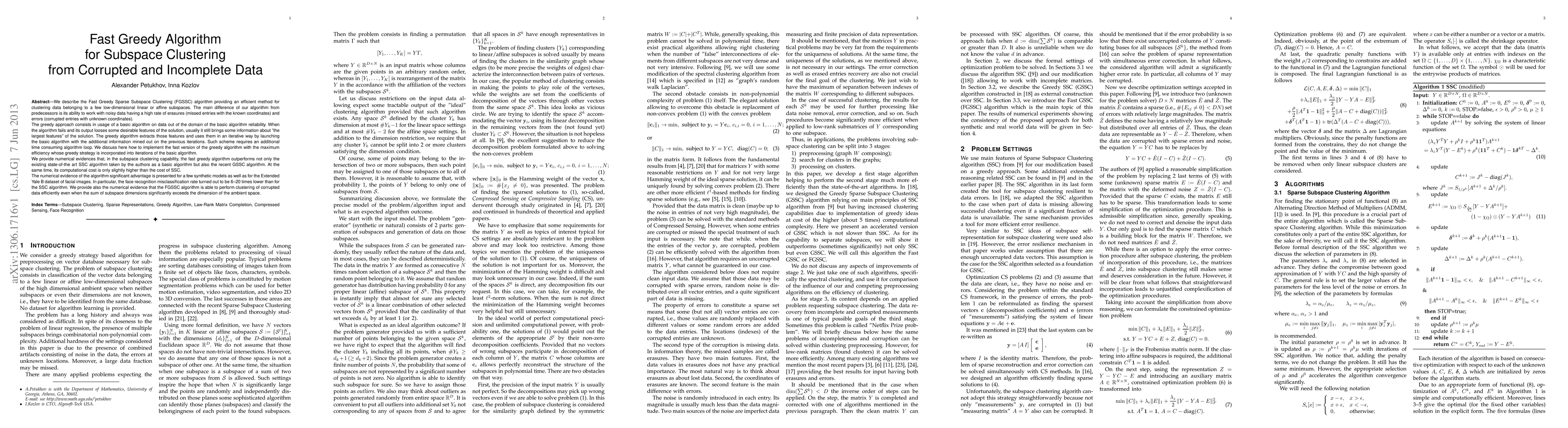 The Fast Greedy Sparse Subspace Clustering (FGSSC) algorithm efficiently clusters data from low-dimensional subspaces, even when data is corrupted and incomplete. It outperforms existing algorithms in subspace clustering while maintaining a comparable computational cost.