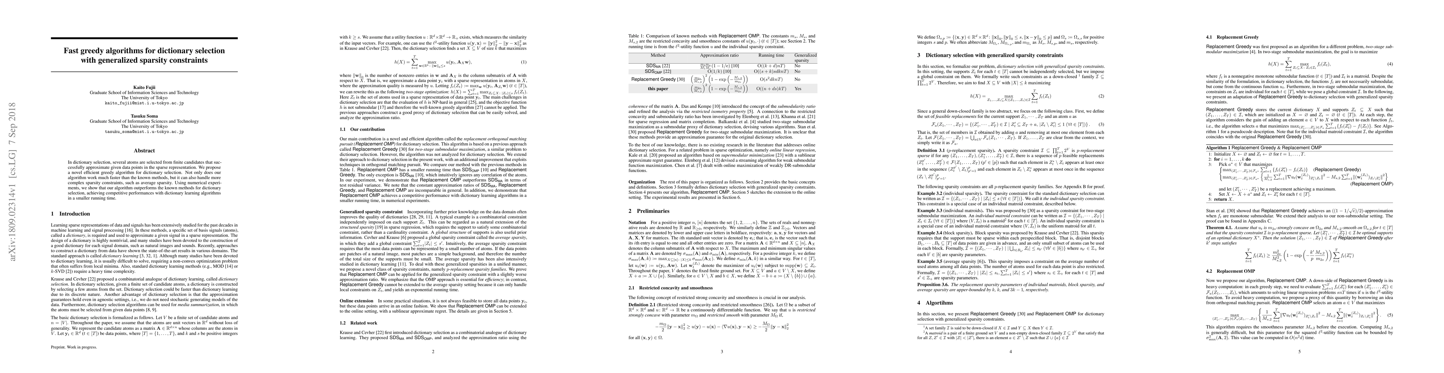 This paper proposes a fast greedy algorithm for dictionary selection that efficiently handles generalized sparsity constraints, outperforming existing methods in both speed and performance, while requiring less computational time compared to dictionary learning algorithms. Numerical experiments validate the algorithm's superior efficiency and effectiveness.
