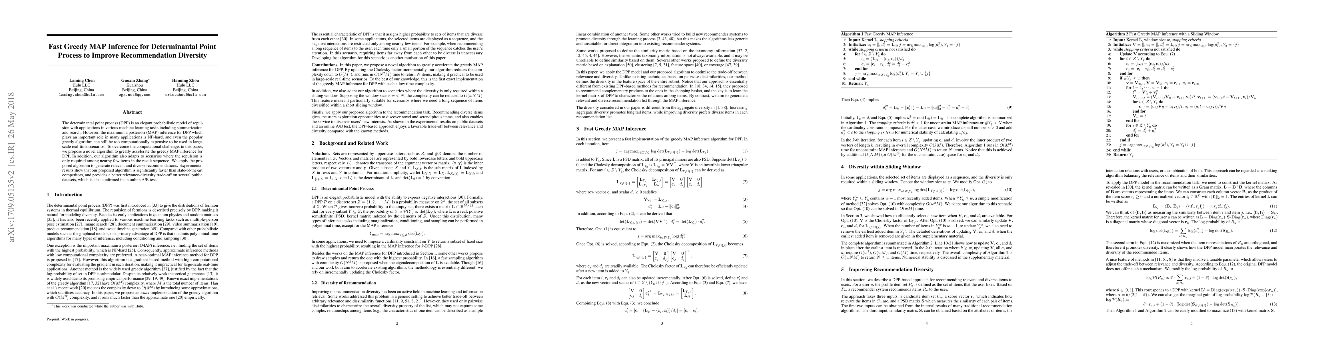 This paper proposes a fast greedy algorithm to accelerate maximum a posteriori inference for determinantal point processes, addressing the computational challenge in large-scale real-time scenarios. The new method improves recommendation diversity and outperforms existing competitors in speed and relevance-diversity trade-off.