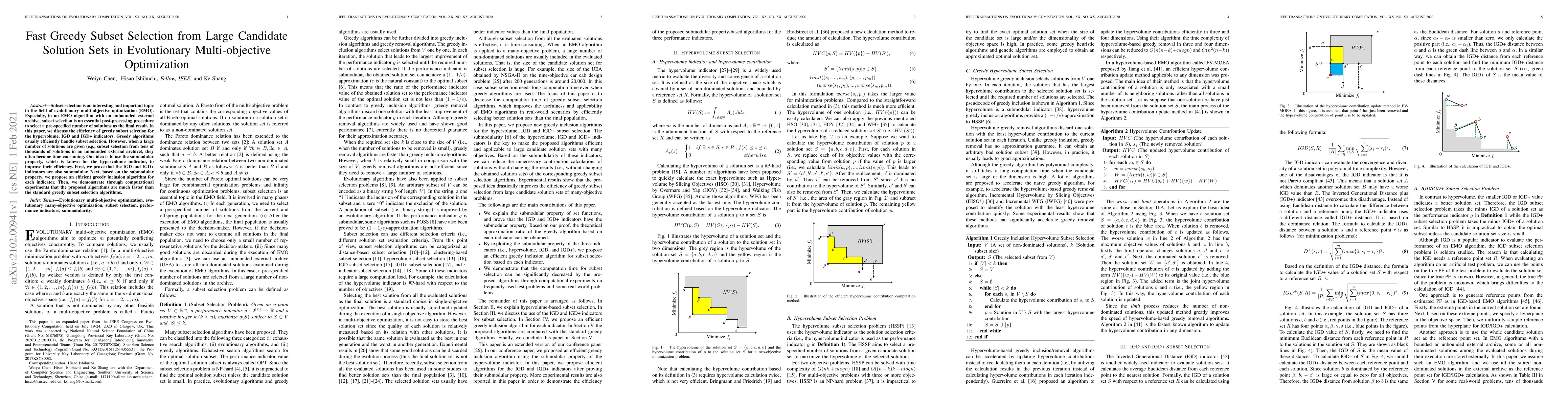 This paper proposes efficient greedy subset selection algorithms for hypervolume, IGD, and IGD+ indicators in evolutionary multi-objective optimization, leveraging the submodular property to improve speed. Computational experiments show these new algorithms outperform standard greedy methods, especially with large candidate solution sets.
