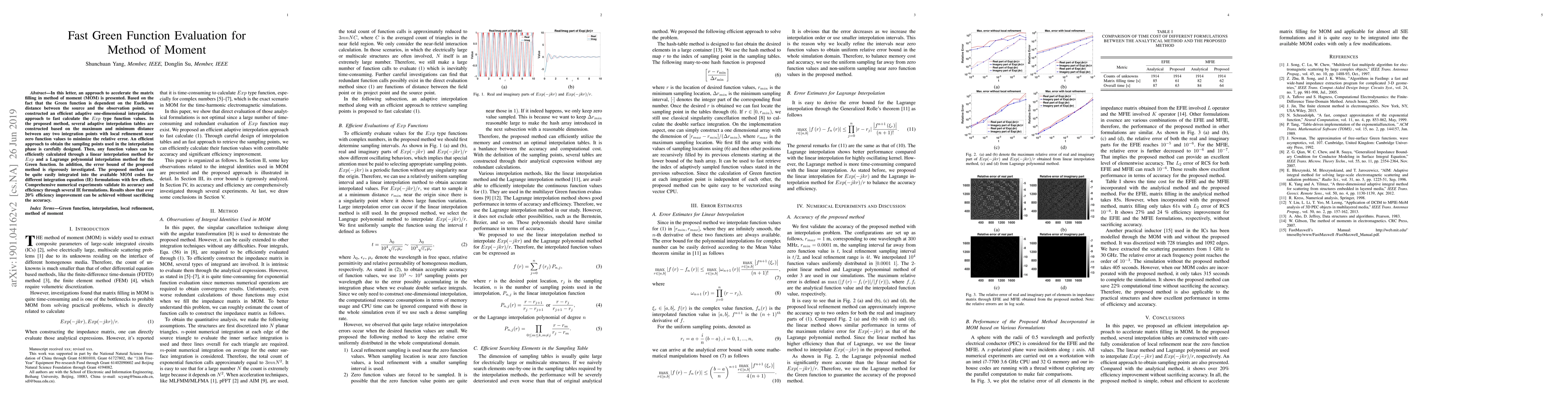 In this letter, an approach to accelerate the matrix filling in method of moment (MOM) is presented. Based on the fact that the Green function is dependent on the Euclidean distance between the source and the observation points, we constructed an efficient adaptive one-dimensional interpolation approach to fast calculate the $Exp$ type function values. In the proposed method, several adaptive interpolation tables are constructed based on the maximum and minimum distance between any two integration points with local refinement near zero function values to minimize the relative error. An efficient approach to obtain the sampling points used in the interpolation phase is carefully designed. Then, any function values can be efficiently calculated through a linear interpolation method for Exp and a Lagrange polynomial interpolation method for the Green function. In addition, the error bound of the proposed method is rigorously investigated. The proposed method can be quite easily integrated into the available MOM codes for different integration equation (IE) formulations with few efforts. Comprehensive numerical experiments validate its accuracy and efficiency through several IE formulations. Results show that over 20% efficiency improvement can be achieved without sacrificing the accuracy.