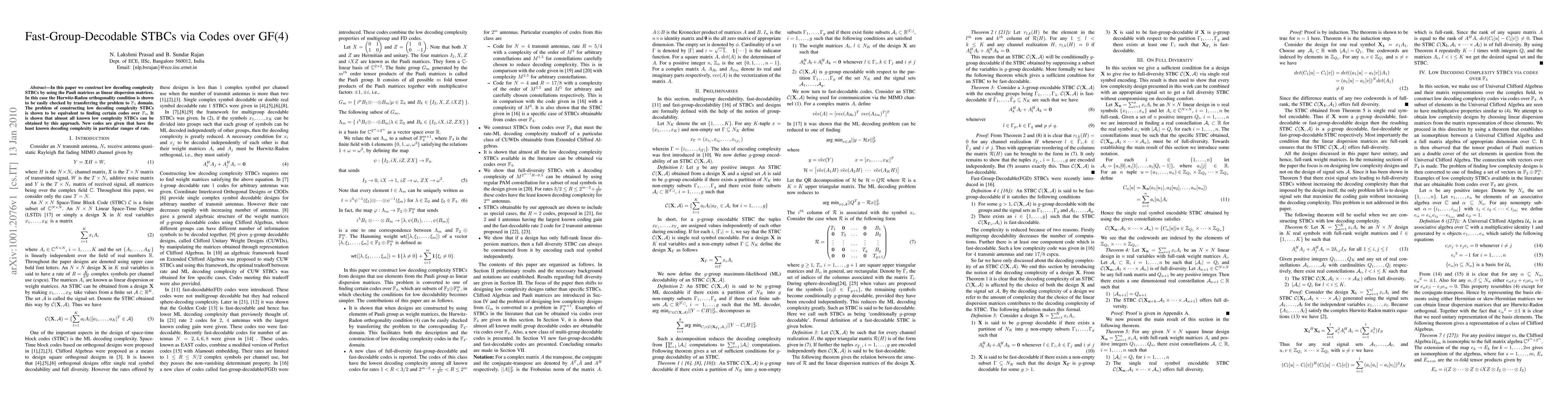 This paper constructs low decoding complexity Space-Time Block Codes (STBCs) using Pauli matrices and codes over GF(4), demonstrating that the Hurwitz-Radon orthogonality condition is easily verified in the $\mathbb{F}_4$ domain. It reveals that constructing such STBCs is equivalent to finding specific codes over $\mathbb{F}_4$, and presents new codes with the least known decoding complexity for certain rate ranges.