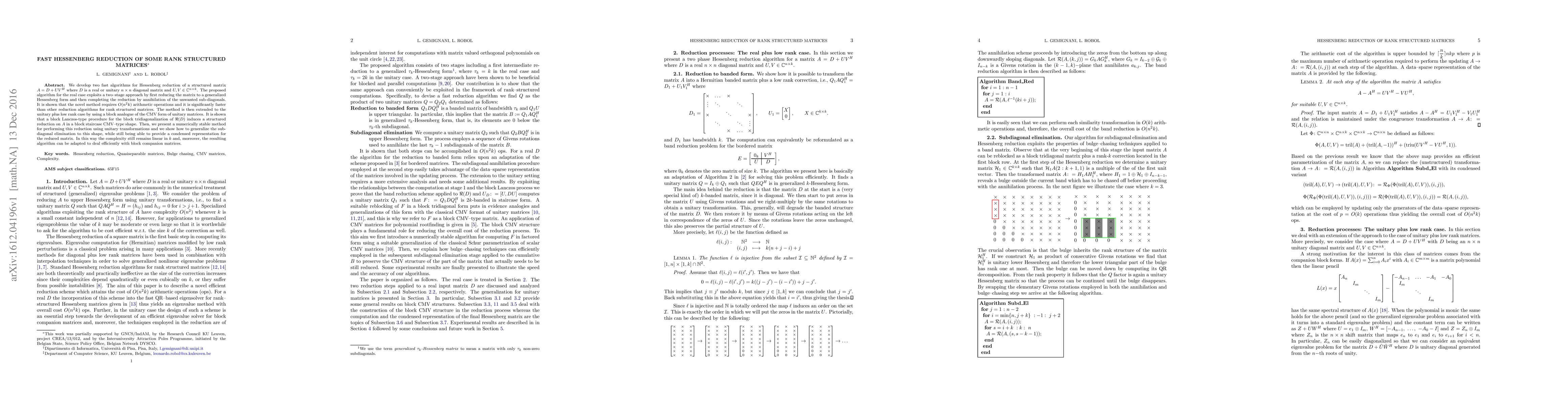 This paper presents two fast algorithms for Hessenberg reduction of rank structured matrices of the form $A = D + UV^H$, where $D$ is a diagonal matrix and $U, V$ are low-rank matrices. The algorithms achieve $O(n^2k)$ operations and are significantly faster than existing methods, with one exploiting a two-stage approach and the other extending the method to unitary matrices using a block Lanczos-type procedure.