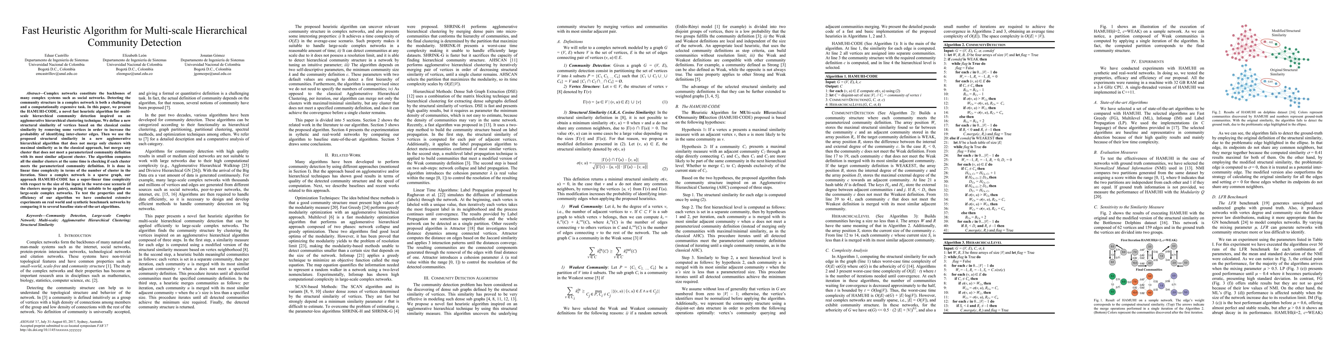 Complex networks constitute the backbones of many complex systems such as social networks. Detecting the community structure in a complex network is both a challenging and a computationally expensive task. In this paper, we present the HAMUHI-CODE, a novel fast heuristic algorithm for multi-scale hierarchical community detection inspired on an agglomerative hierarchical clustering technique. We define a new structural similarity of vertices based on the classical cosine similarity by removing some vertices in order to increase the probability of identifying inter-cluster edges. Then we use the proposed structural similarity in a new agglomerative hierarchical algorithm that does not merge only clusters with maximal similarity as in the classical approach, but merges any cluster that does not meet a parameterized community definition with its most similar adjacent cluster. The algorithm computes all the similar clusters at the same time is checking if each cluster meets the parameterized community definition. It is done in linear time complexity in terms of the number of cluster in the iteration. Since a complex network is a sparse graph, our approach HAMUHI-CODE has a super-linear time complexity with respect to the size of the input in the worst-case scenario (if the clusters merge in pairs), making it suitable to be applied on large-scale complex networks. To test the properties and the efficiency of our algorithm we have conducted extensive experiments on real world and synthetic benchmark networks by comparing it to several baseline state-of-the-art algorithms.