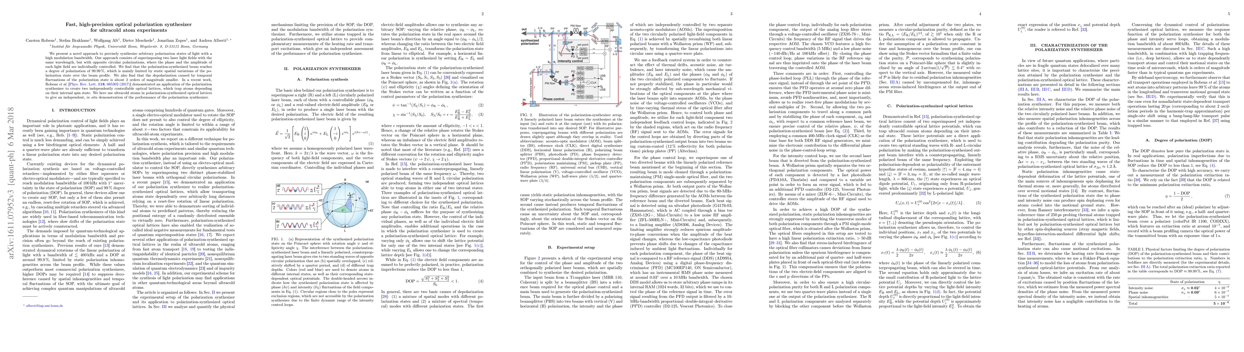 We present a novel approach to precisely synthesize arbitrary polarization states of light with a high modulation bandwidth. Our approach consists of superimposing two laser light fields with the same wavelength, but with opposite circular polarizations, where the phase and the amplitude of each light field are individually controlled. We find that the polarization-synthesized beam reaches a degree of polarization of 99.99%, which is mainly limited by static spatial variations of the polarization state over the beam profile. We also find that the depolarization caused by temporal fluctuations of the polarization state is about 2 orders of magnitude smaller. In a recent work, Robens et al. [Phys. Rev. Lett. 118, 065302 (2017)] demonstrated an application of the polarization synthesizer to create two independently controllable optical lattices, which trap atoms depending on their internal spin state. We here use ultracold atoms in polarization-synthesized optical lattices to give an independent, in situ demonstration of the performance of the polarization synthesizer.