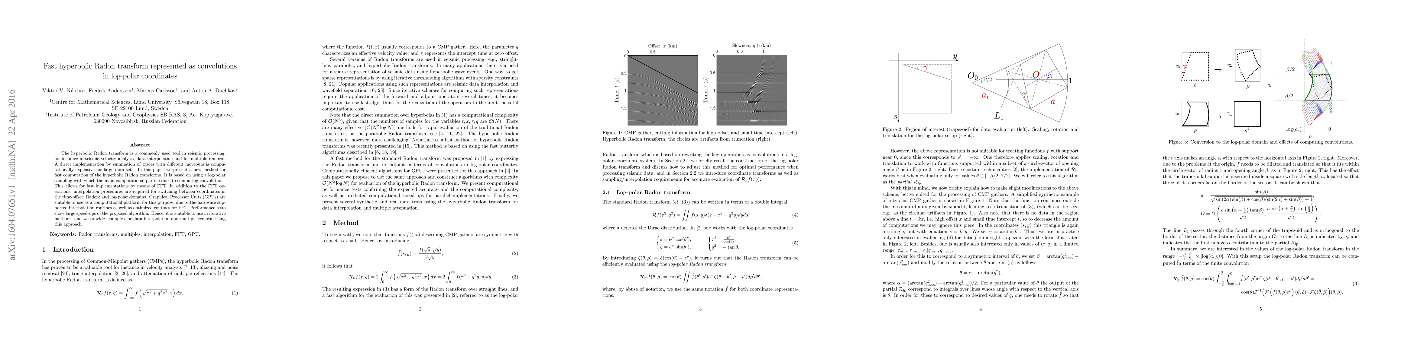 This paper introduces a fast method for computing hyperbolic Radon transforms using log-polar coordinates, reducing computations to convolutions and leveraging FFT for efficiency. The approach, implementable on GPUs, shows significant speed-ups and is applied to data interpolation and multiple removal.