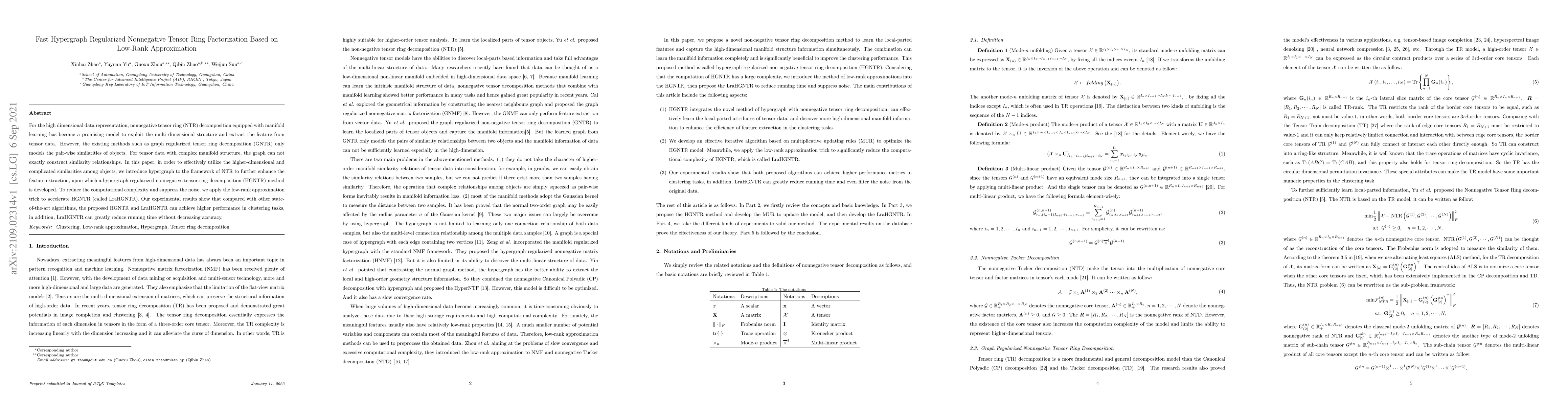 This paper proposes a hypergraph regularized nonnegative tensor ring decomposition (HGNTR) method to enhance feature extraction from tensor data by modeling higher-dimensional similarities. To improve efficiency and reduce noise, a low-rank approximation is applied, resulting in LraHGNTR, which achieves higher performance in clustering tasks and significantly reduces running time compared to other methods.