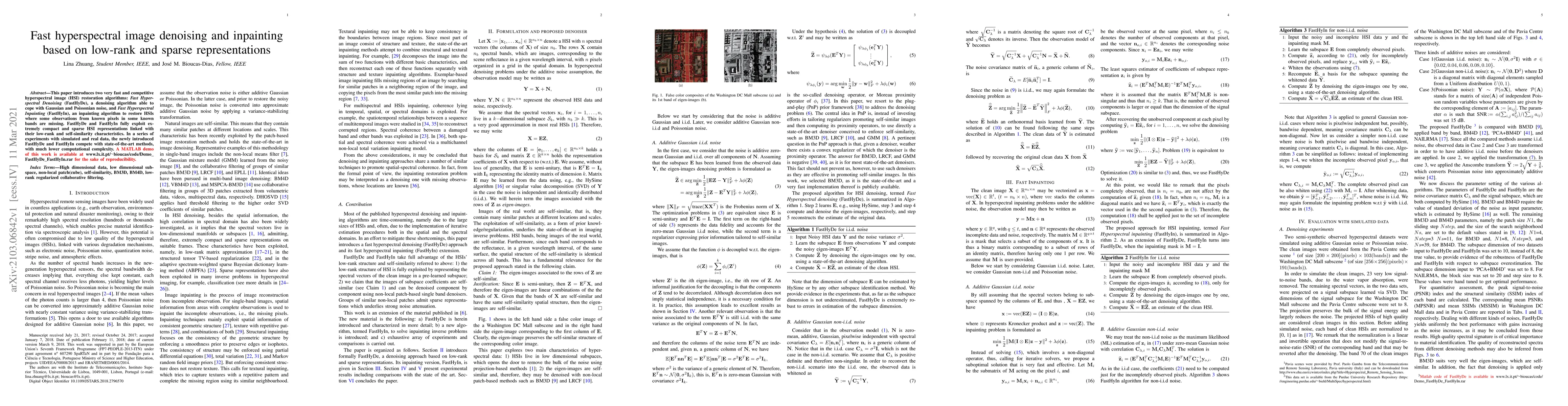 This paper presents two efficient algorithms, FastHyDe and FastHyIn, for denoising and inpainting hyperspectral images, leveraging low-rank and sparse representations. Both algorithms outperform state-of-the-art methods with significantly lower computational complexity.