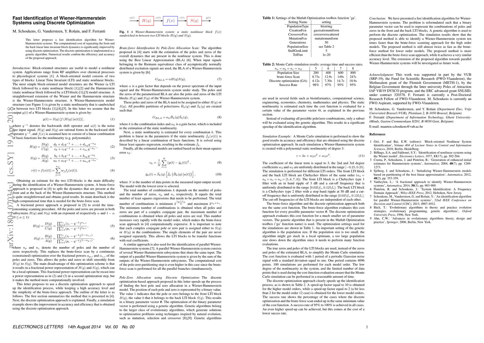 This paper introduces a fast identification algorithm for Wiener-Hammerstein systems using discrete optimization via a genetic algorithm, significantly reducing computational costs while maintaining high accuracy, as demonstrated by numerical results.