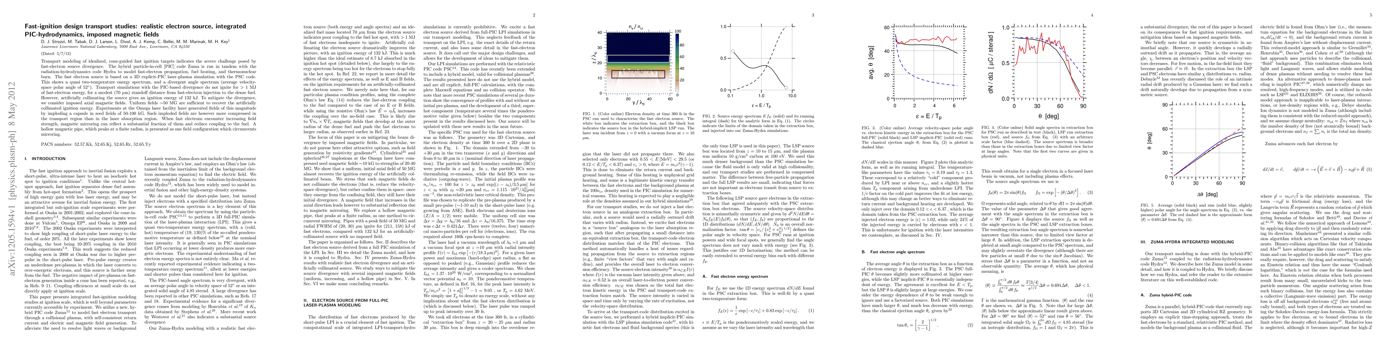 Transport modeling of idealized, cone-guided fast ignition targets indicates the severe challenge posed by fast-electron source divergence. The hybrid particle-in-cell [PIC] code Zuma is run in tandem with the radiation-hydrodynamics code Hydra to model fast-electron propagation, fuel heating, and thermonuclear burn. The fast electron source is based on a 3D explicit-PIC laser-plasma simulation with the PSC code. This shows a quasi two-temperature energy spectrum, and a divergent angle spectrum (average velocity-space polar angle of 52 degrees). Transport simulations with the PIC-based divergence do not ignite for > 1 MJ of fast-electron energy, for a modest 70 micron standoff distance from fast-electron injection to the dense fuel. However, artificially collimating the source gives an ignition energy of 132 kJ. To mitigate the divergence, we consider imposed axial magnetic fields. Uniform fields ~50 MG are sufficient to recover the artificially collimated ignition energy. Experiments at the Omega laser facility have generated fields of this magnitude by imploding a capsule in seed fields of 50-100 kG. Such imploded fields are however more compressed in the transport region than in the laser absorption region. When fast electrons encounter increasing field strength, magnetic mirroring can reflect a substantial fraction of them and reduce coupling to the fuel. A hollow magnetic pipe, which peaks at a finite radius, is presented as one field configuration which circumvents mirroring.