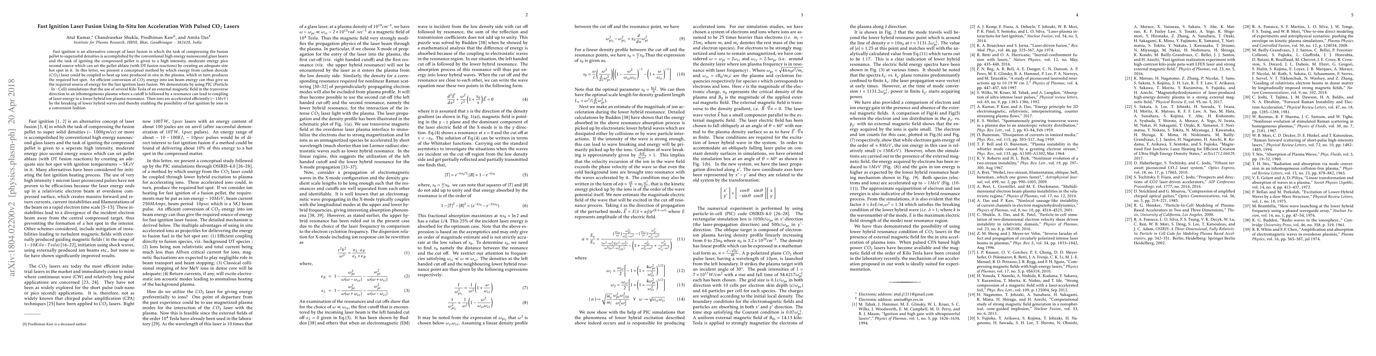 This paper proposes a method for fast ignition laser fusion using in-situ ion acceleration with pulsed CO2 lasers to create a hot spot in a compressed fusion pellet. Simulations show that a kilo Tesla magnetic field can efficiently couple laser energy to lower hybrid waves, accelerating ions to ~1 MeV for effective ignition.