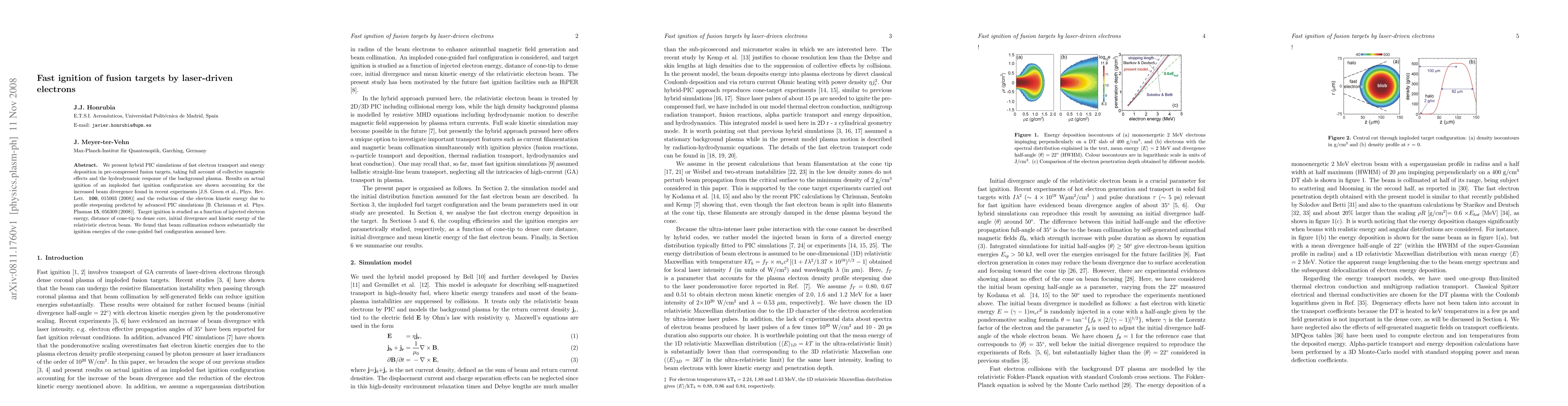 This paper presents hybrid PIC simulations of laser-driven electrons initiating fusion in pre-compressed targets, considering magnetic effects and plasma dynamics. It finds that beam collimation significantly lowers ignition energy for a cone-guided fuel configuration.